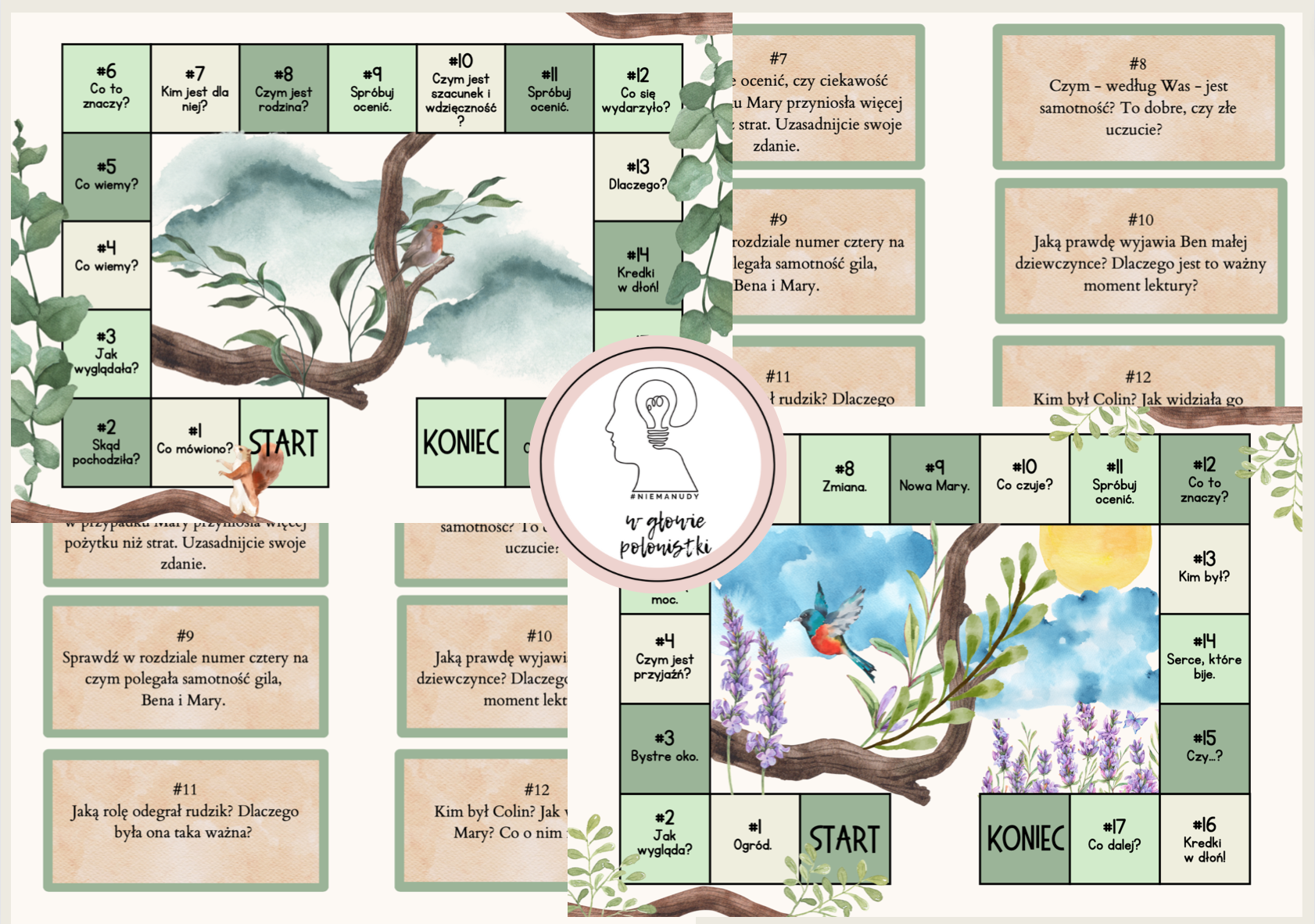 Gra zawiera cztery plansze i siedemnaście pytań do każdej z nich. Pytania są związane z różnymi etapami przemiany Mary Lenox, dzięki nim podzielicie klasę na cztery grupy a każda z nich opracuje zupełnie inny portret głównej bohaterki.