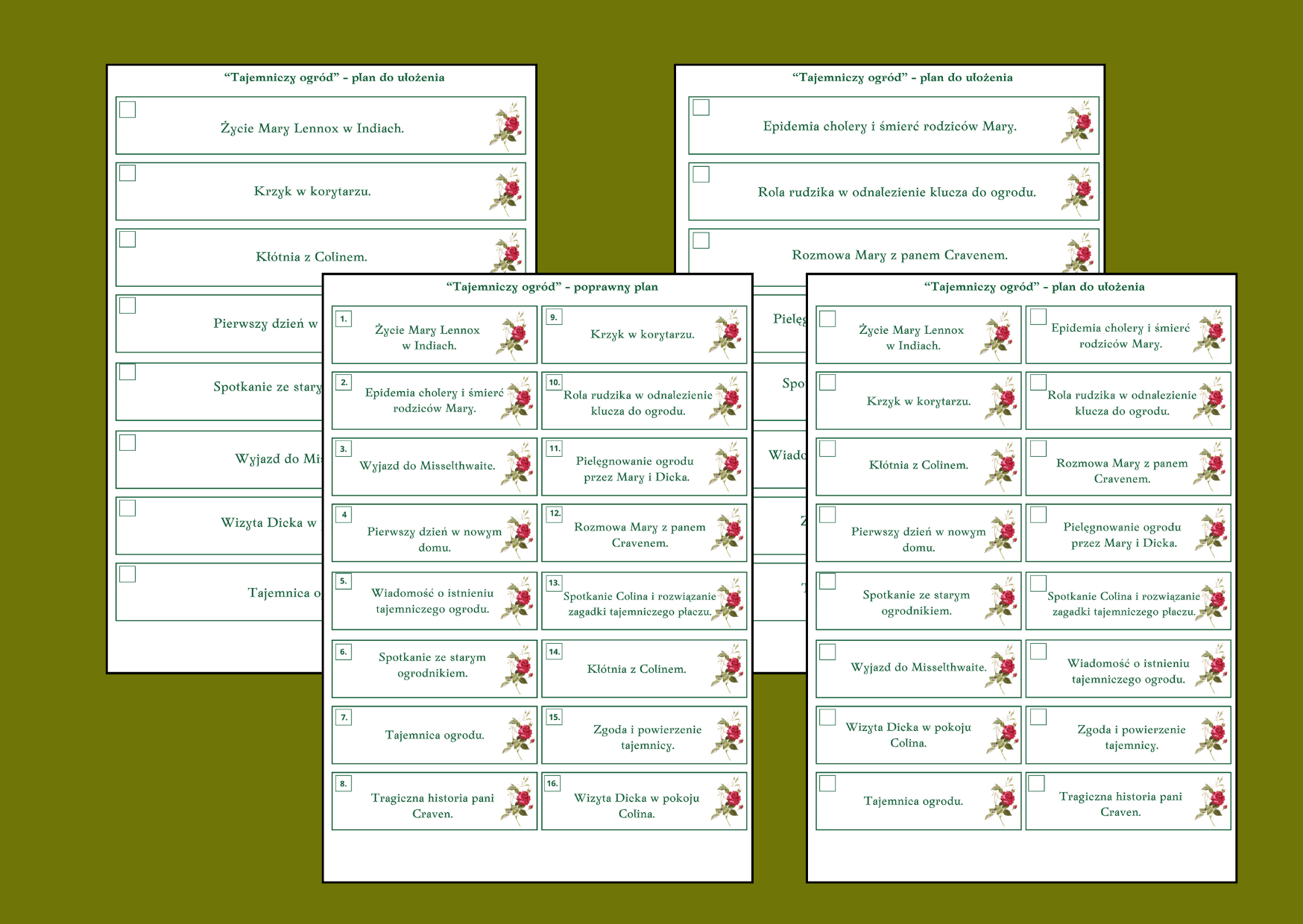 Materiał zawiera fiszki w 3 wersjach planu wydarzeń (pdf, format A4) dotyczącego treści „Tajemniczego ogrodu”: wersja planu poprawnego i wersja do ułożenia dla uczniów (można ją rozdać uczniom, by mogli – po wycięciu i ułożeniu – wkleić poprawny plan do zeszytu), większy format – wersja do ułożenia dla grup ( można ją po wydrukowaniu zalaminować, by posłużyła dłużej i wyciąć).
