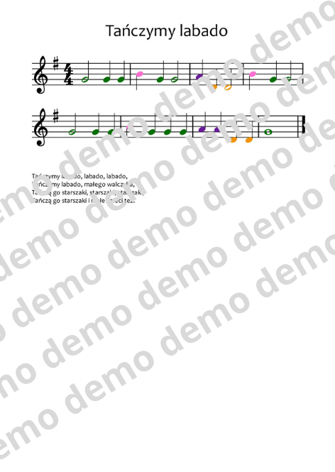 Obie strony (nuty kolorowe i literowe) dostępne są w poglądzie materiału. Do piosenki dołaczam też gamę C-dur, której dźwięki odpowiadają kolorami nutom.