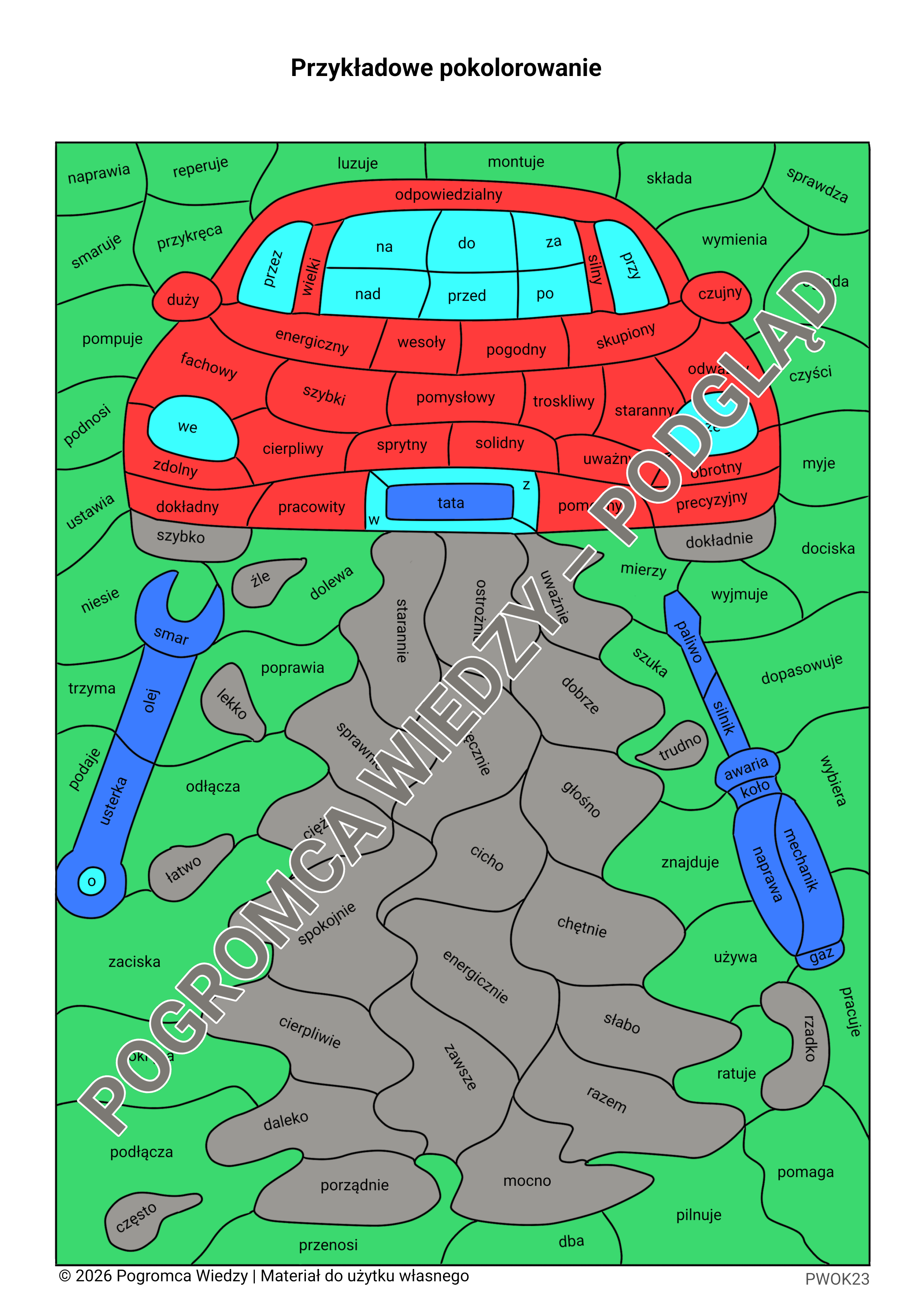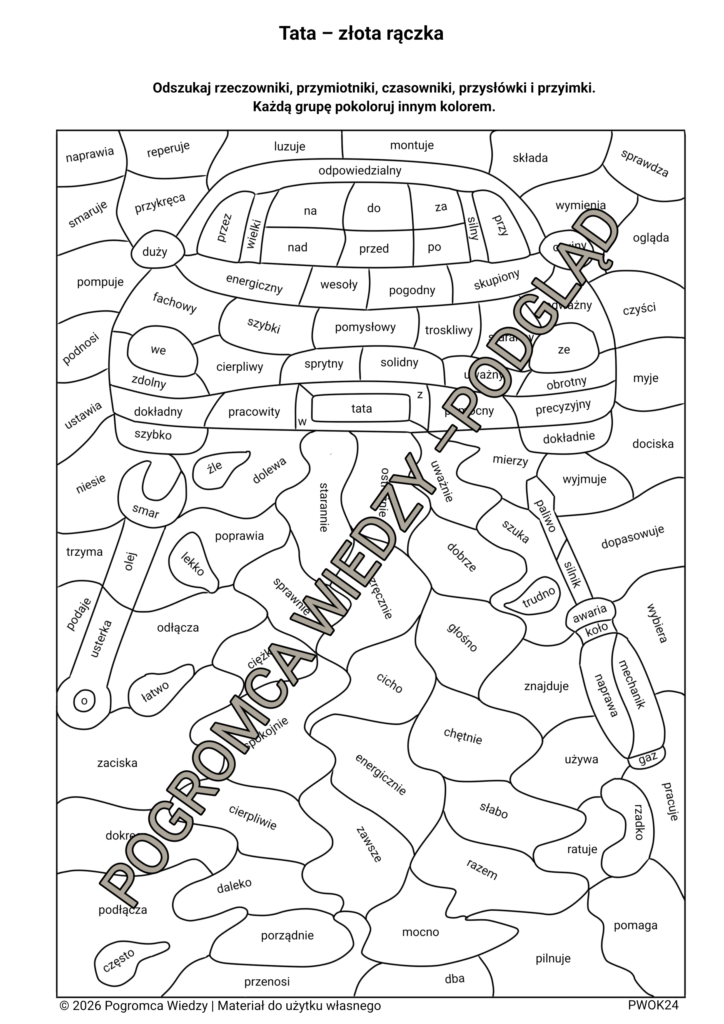 Uczniowie odszukują i rozpoznają części mowy. Następnie kolorują według polecenia. Ćwiczenie sprawdzi się jako zadanie utrwalające części mowy oraz rozwijające słownictwo uczniów.