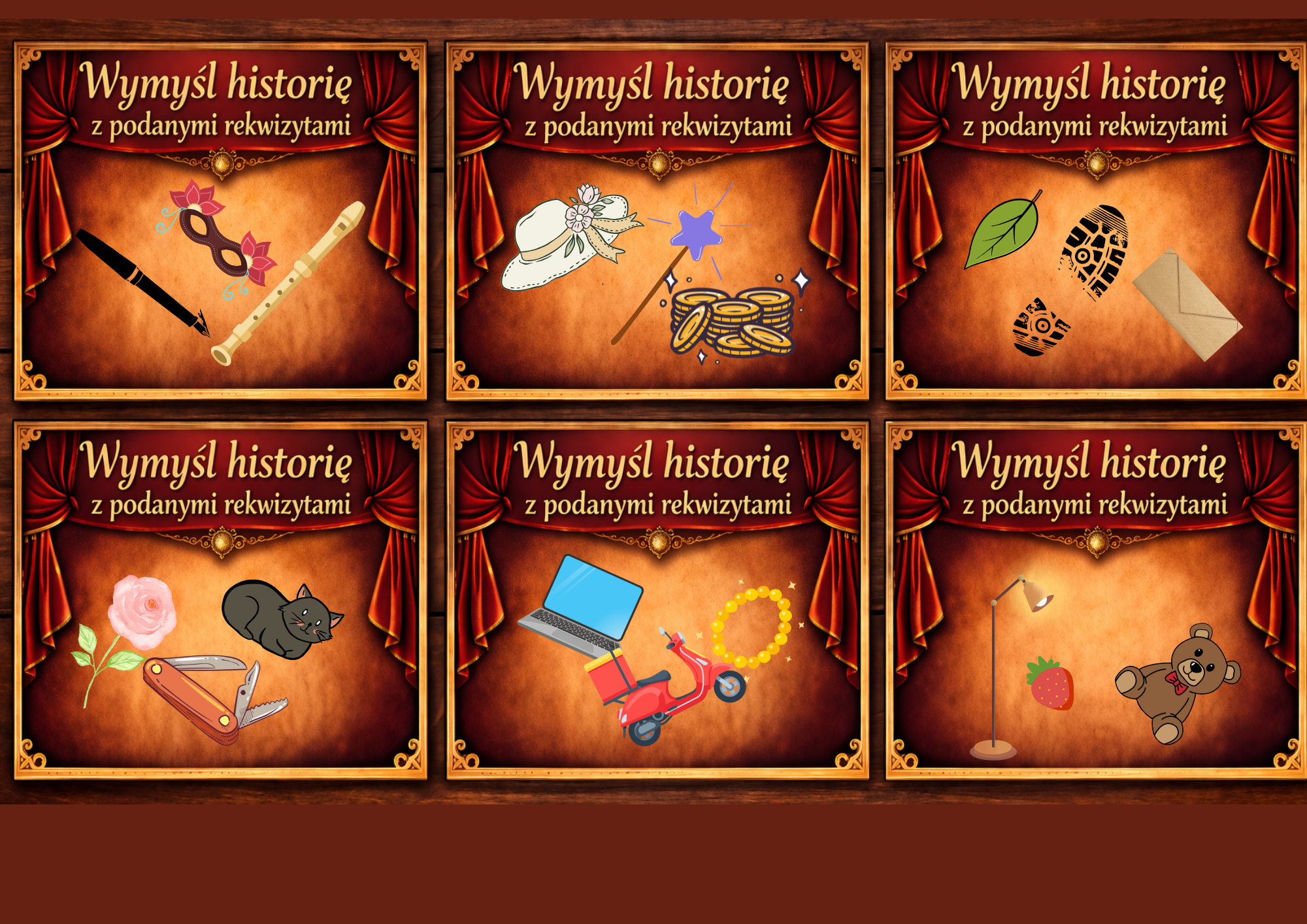 - 12x fiszek z grą "Rekwizyty" zawierającą słownie wypisane rekwizyty do ułożenia historii