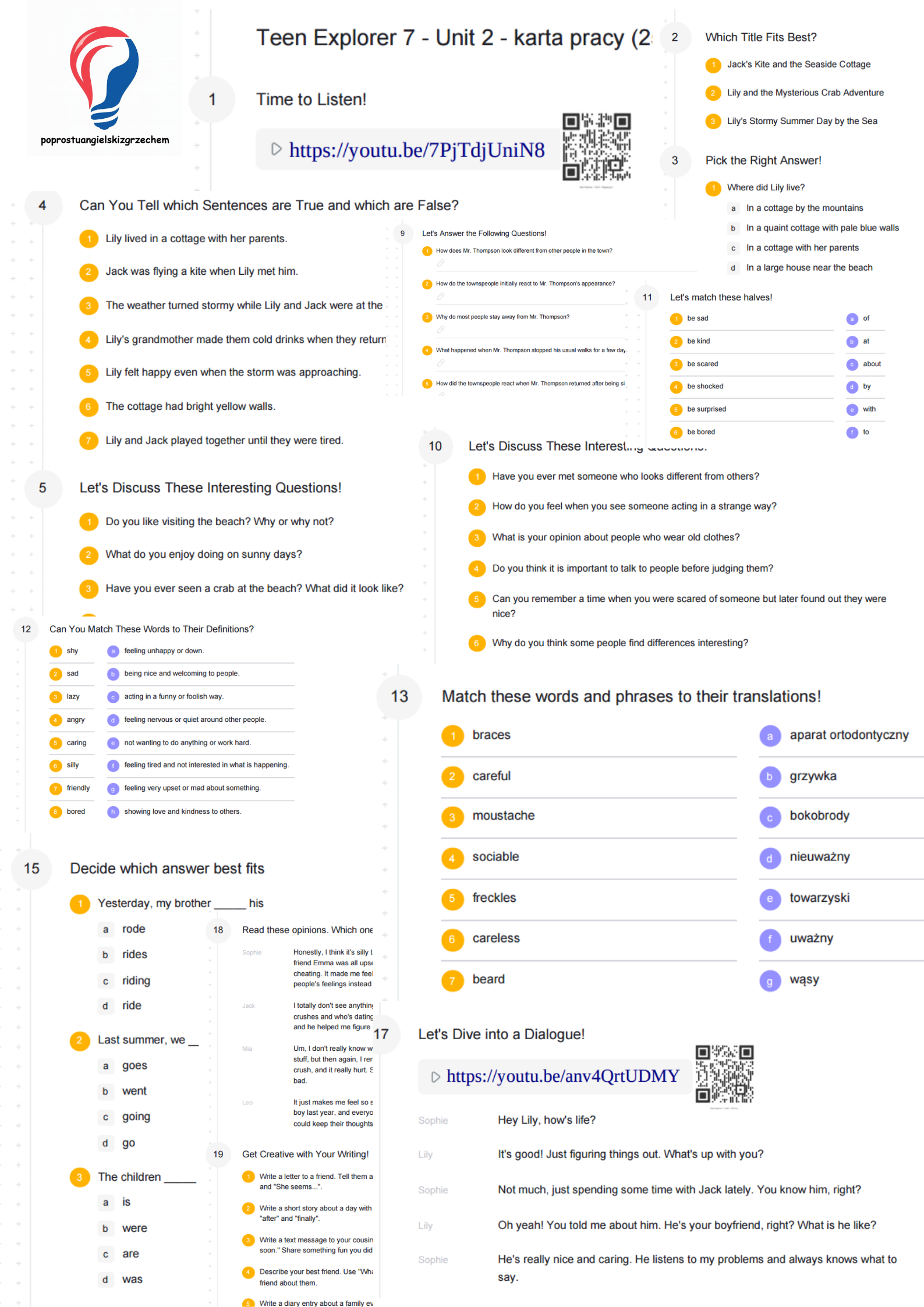 20 zadań zostało opracowanych na podstawie działu drugiego z podręcznika Teen Explorer 7. Słownictwo z tego działu w postaci testów możesz znaleźć tutaj, a w postaci krzyżówek tutaj. Niniejszą kartę pracy możesz wykorzystać do przeprowadzenia całej lekcji w zakresie słuchania, czytania, konwersacji, słownictwa oraz pisania. Możesz też podzielić lekcję na ćwiczenie każdej z tych umiejętności z osobna, gdyż każde zadanie zostało umieszczone na osobnej stronie.