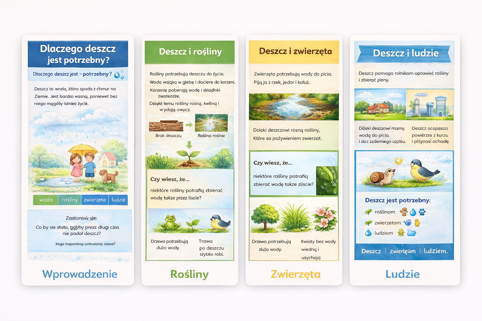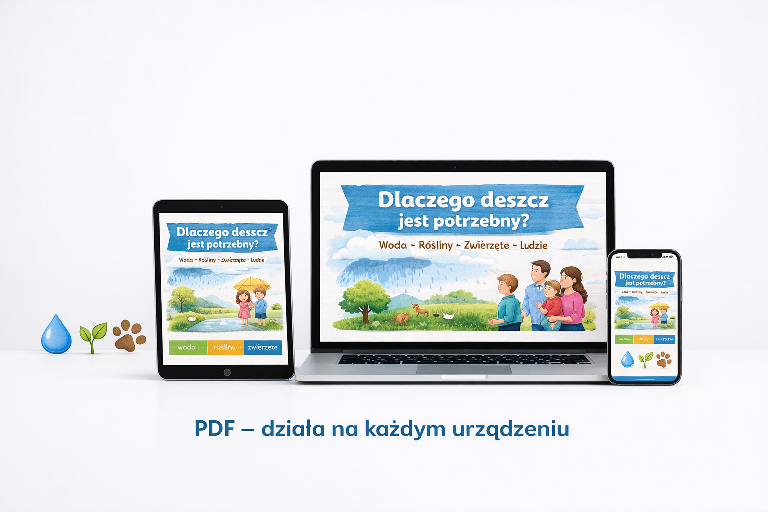 „Dlaczego deszcz jest potrzebny?” to kompletny, estetyczny i nowoczesny materiał edukacyjny w wersji cyfrowej (PDF), stworzony z myślą o dzieciach oraz nauczycielach, którzy chcą uczyć w sposób ciekawy, angażujący i wizualnie atrakcyjny 🌱🐾👨👩👧