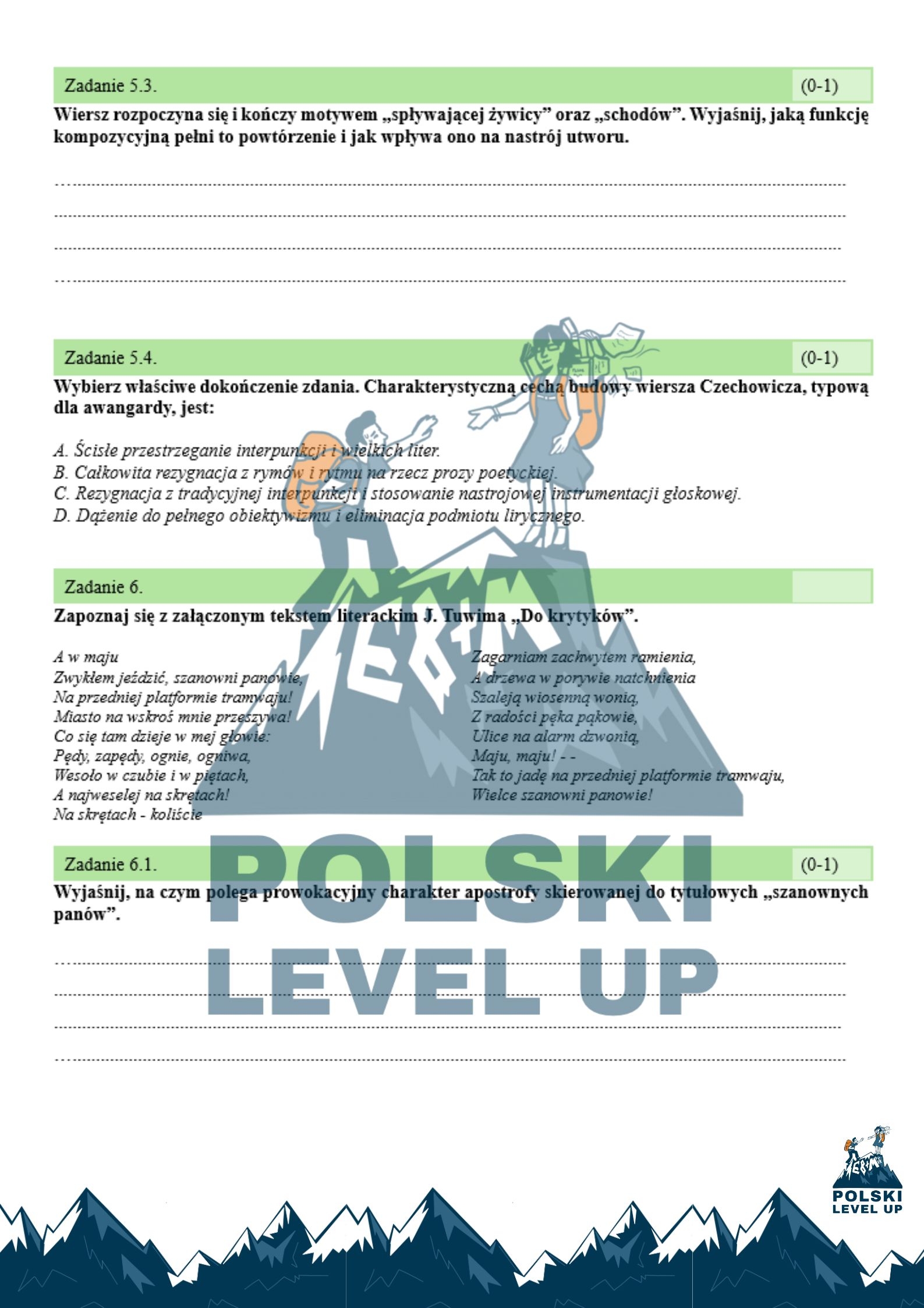 Zestaw składa się z 20 zadań opartych na najważniejszych tekstach epoki. W arkuszu przeanalizujesz wiersze takich gigantów jak: Julian Tuwim (witalizm i skandale obyczajowe),Julian Przyboś (dynamizm miasta i cywilizacji), Maria Pawlikowska-Jasnorzewska (misterna miniatura poetycka), Bolesław Leśmian (zaświaty, neologizmy i natura), Józef Czechowicz (katastrofizm i oniryzm).
