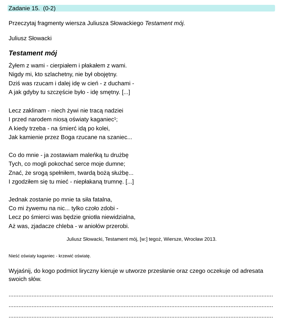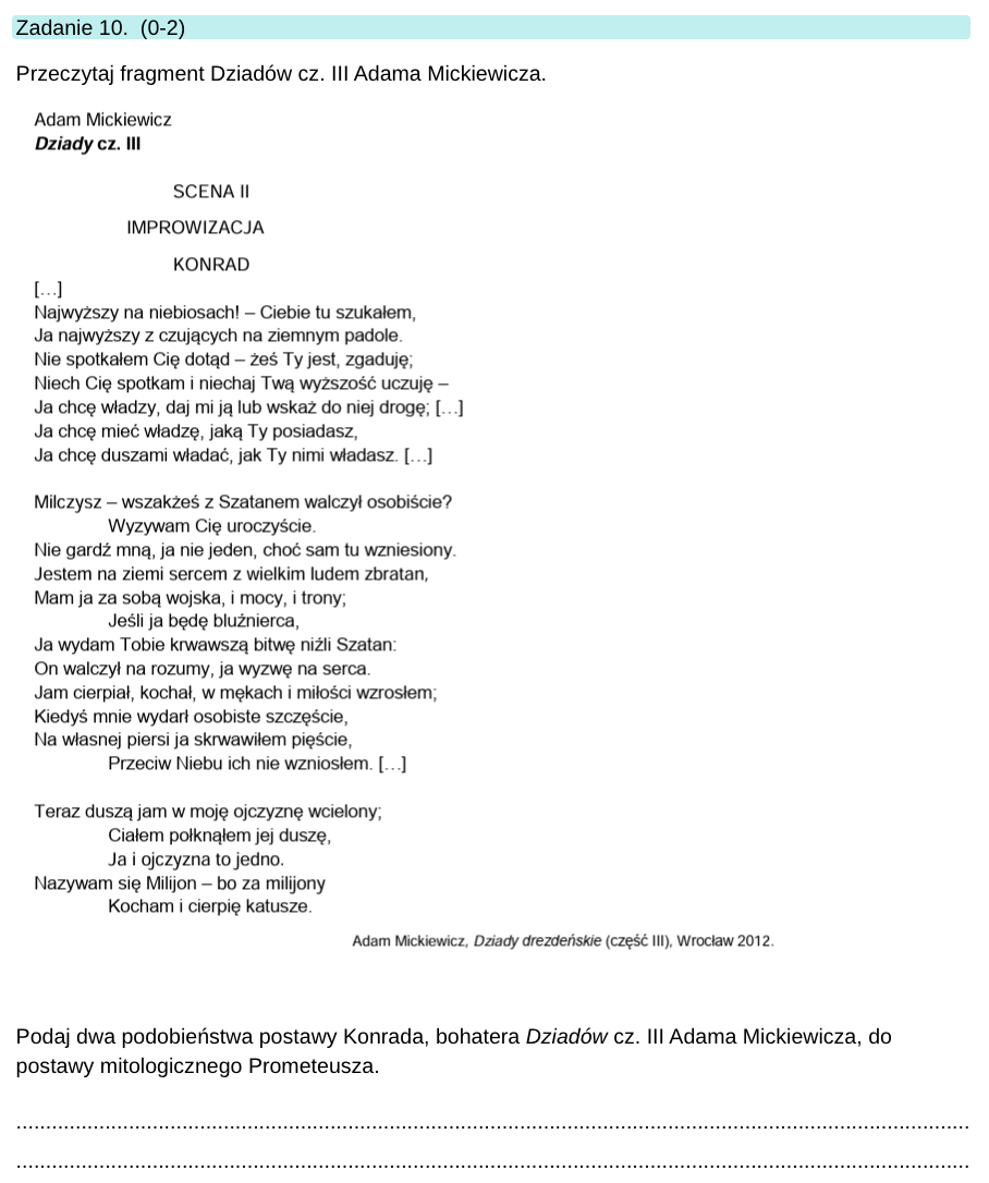 Plik jest zbiorem, który zawiera 18 (niektóre złozone są z dwóch części) zadań maturalnych dotyczących epoki romantyzmu. Obejmuje pytania do lektur obowiązkowych (m.in. "Dziady" cz. III, "Romantyczność") jak i do tych uzupełniających lub omawianych we fragmentach (m.in. "Kordian", "Oda do młodości", "Testament mój"). Zdania pochodzą z informatora, matur z ubiegłych lat oraz z repetytoriów maturalnych.