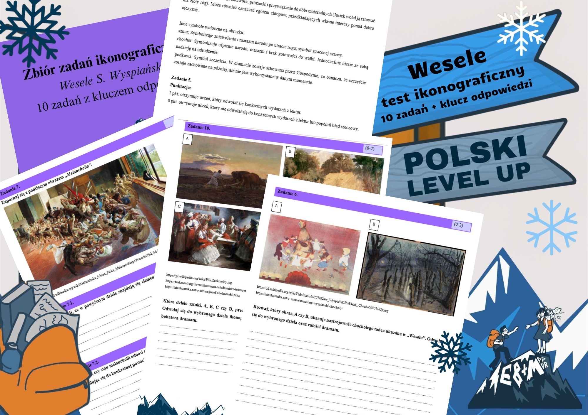 Test ikonograficzny w formule maturalnej poświęcony "Weselu" S. Wyspiańskiego. Zestaw składa się z 10 zadań, do których dołączone są teksty kultury. Na końcu znajduje się klucz odpowiedzi. Materiał został przygotowany w oparciu o typy zadań, które pojawiają się na maturze. Polecam ten zestaw jako ćwiczenia z klasą podczas omawiania lektury lub jako sprawdzian po omówieniu dzieła. Jest to również pomoc do samodzielnej pracy dla uczniów