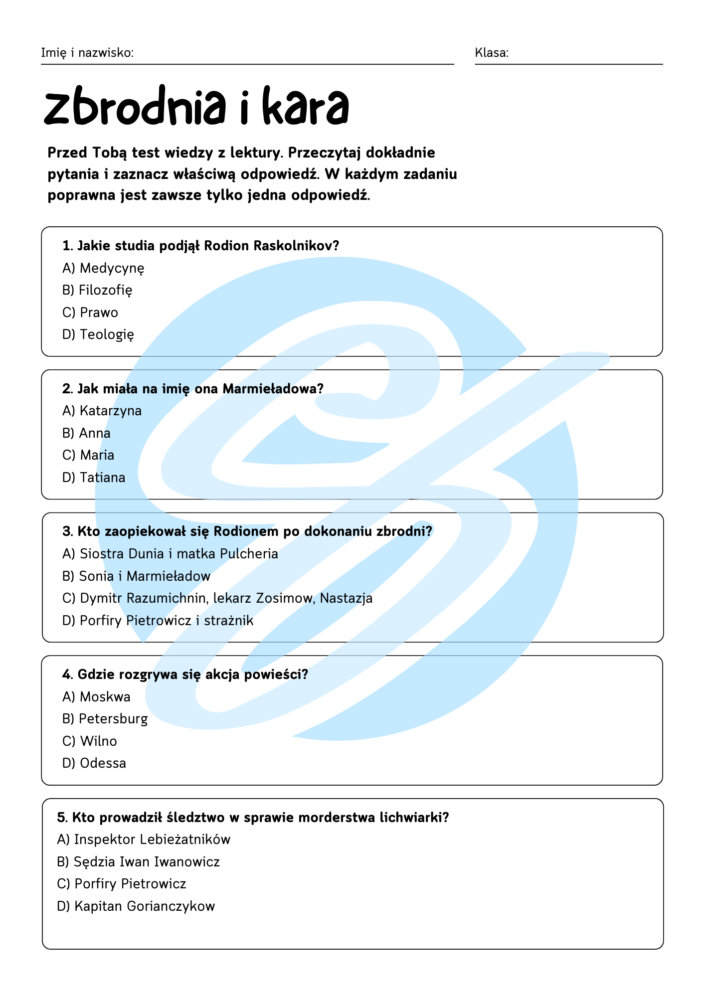 Test z lektury „Zbrodnia i kara” Fiodora Dostojewskiego to gotowy materiał edukacyjny dla nauczycieli szkół średnich. Obejmuje najważniejsze zagadnienia związane z treścią, symboliką, bohaterami oraz kontekstem literackim dramatu. Materiał sprawdzi się doskonale jako test sprawdzający, powtórzeniowy lub przygotowujący do matury.
