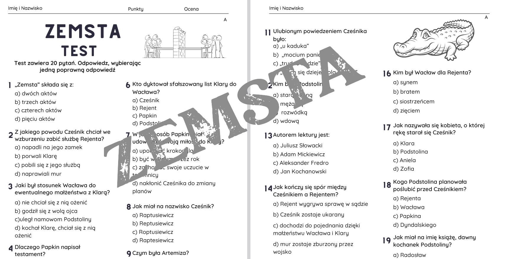 W skład materiału dotyczącego danej lektury wchodzą dwa warianty testu (20 pytań)– grupa A i grupa B. Oba testy zawierają pytania jednokrotnego wyboru, jednak różnią się między sobą innym ułożeniem pytań i odpowiedzi, co pozwala na bezproblemowe przeprowadzenie sprawdzianu w większych klasach i ogranicza możliwość przepisywania.
