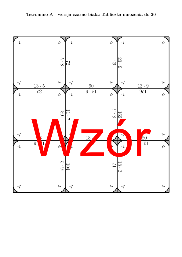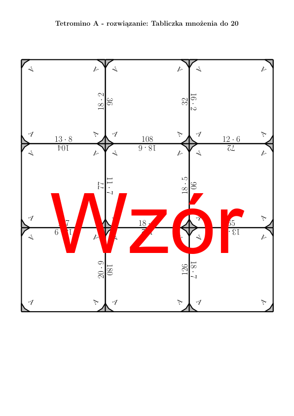 W materiale znajduje się łącznie 30 różnych zestawów tetramino na temat tabliczka mnożenia do 20 w następującym układzie: