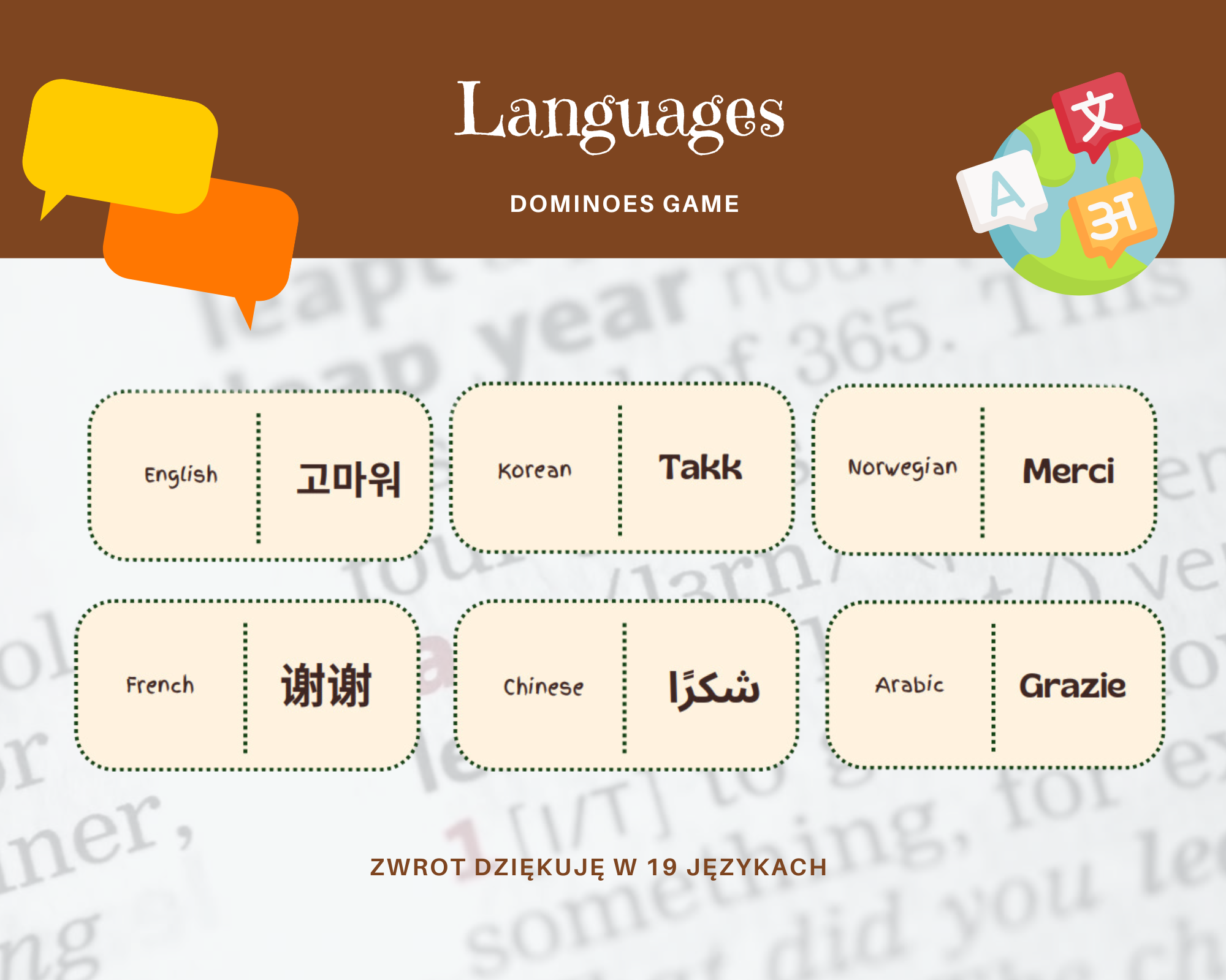 W zestawie znajdziesz karty domino z wyrazami „dziękuję” w 19 różnych językach, takich jak: angielski, koreański, norweski, francuski, chiński, arabski, włoski, turecki, hindi, swahili, hebrajski, esperanto, rosyjski, tajski, hiszpański, chorwacki, grecki, polski oraz hawajski.