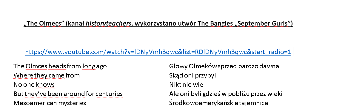 Dokument zawiera tłumaczenie piosenki kanału HistoryTeachers pt. The Olmecs, która wykorzystuje melodię piosenki September Gurls zespołu The Bangles. Pozwala lepiej zrozumieć zagadnienia związane z cywilizacją prekolumbijską.
