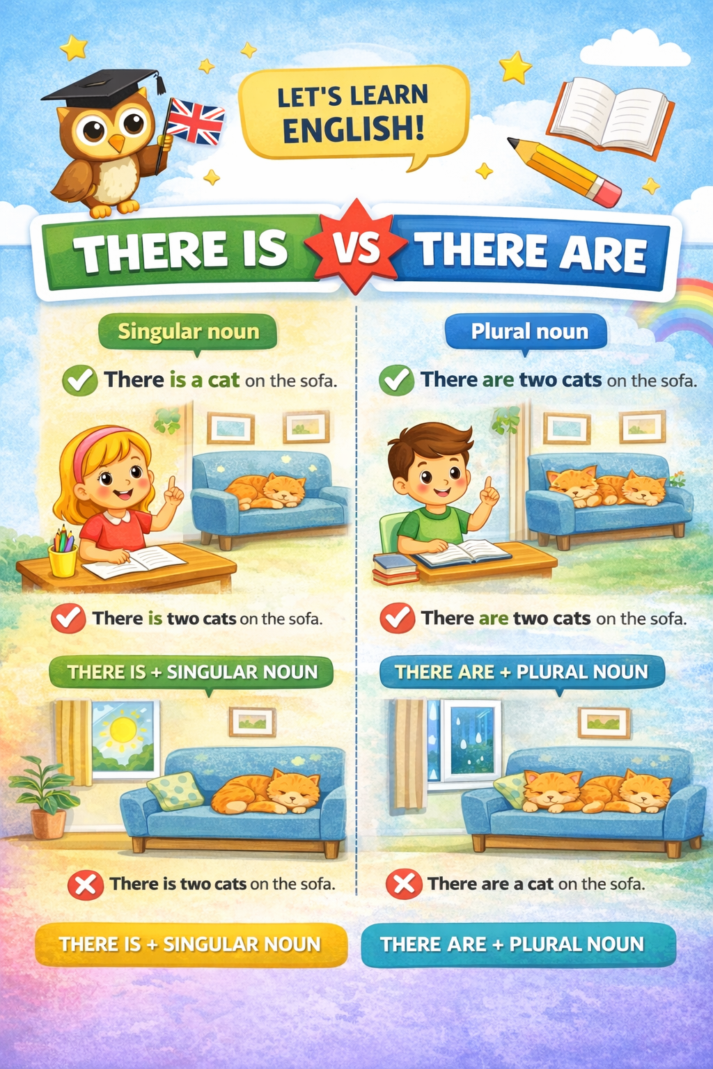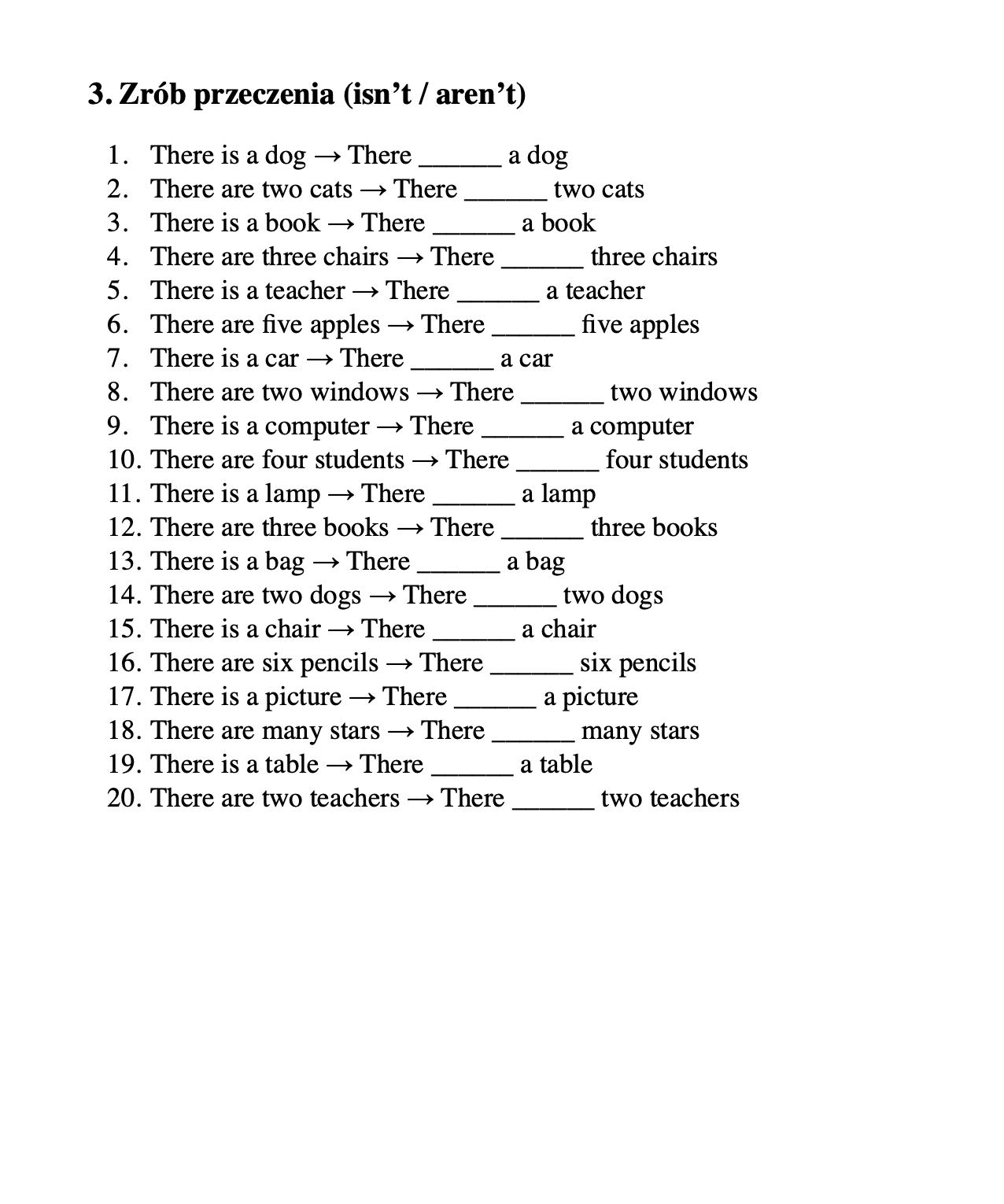 Karta pracy została przygotowana dla uczniów szkoły podstawowej i koncentruje się na wprowadzeniu oraz utrwaleniu konstrukcji There is / There are. Uczniowie ćwiczą rozróżnianie liczby pojedynczej i mnogiej oraz poprawne stosowanie form „is” i „are” w zdaniach twierdzących, przeczeniach i pytaniach.