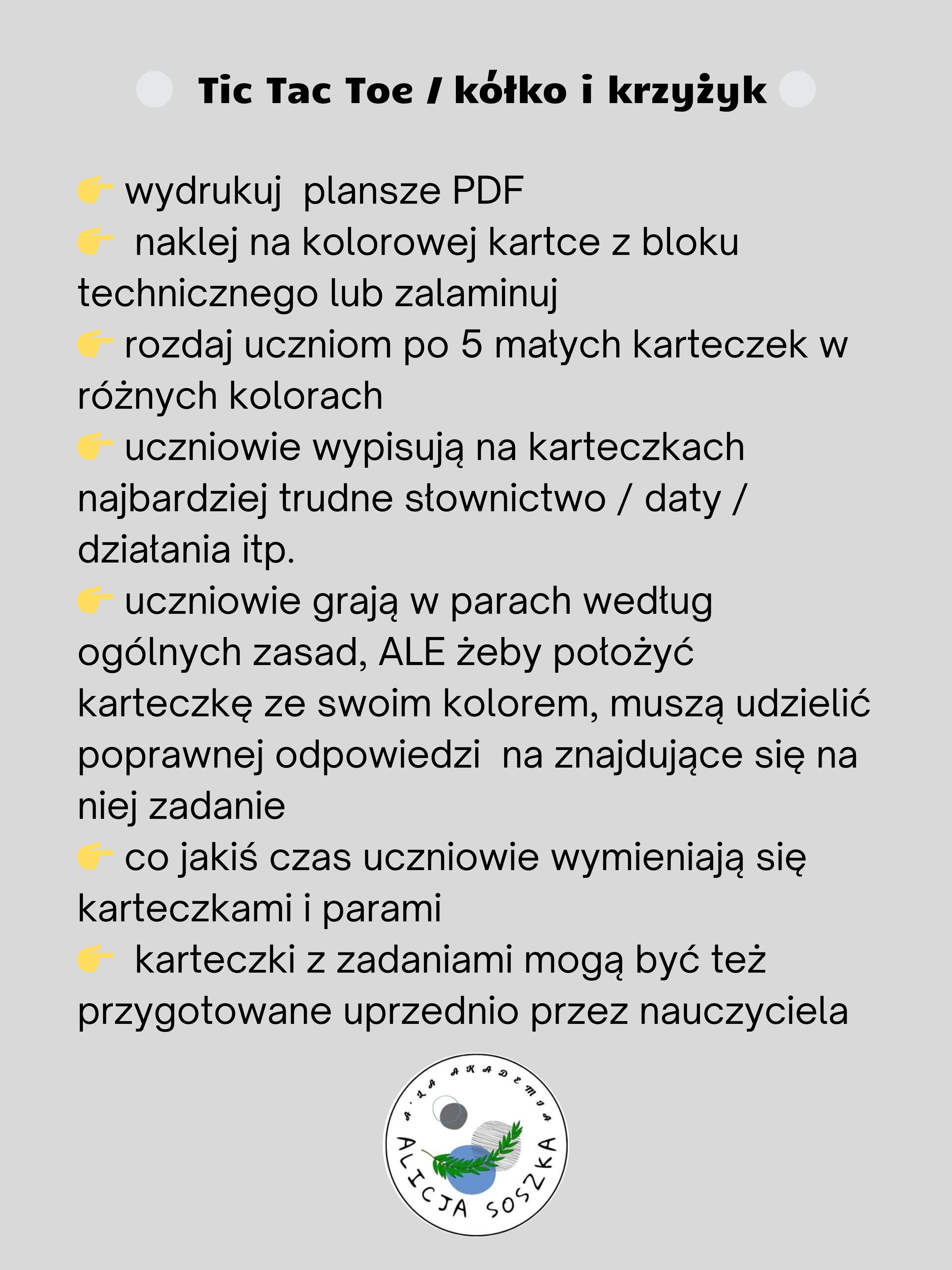 ⚪ Tic Tac Toe / kółko i krzyżyk ⚪ 👉 wydrukuj plansze PDF 👉 naklej na kolorowej kartce z bloku technicznego lub zalaminuj 👉 rozdaj uczniom po 5 małych karteczek w różnych kolorach 👉 uczniowie wypisują na karteczkach najbardziej trudne słownictwo / daty / działania itp. 👉 uczniowie grają w parach według ogólnych zasad, ALE żeby położyć karteczkę ze swoim kolorem, muszą udzielić poprawnej odpowiedzi na znajdujące się na niej zadanie 👉 co jakiś czas uczniowie wymieniają się karteczkami i parami 👉 karteczki z zadaniami mogą być też przygotowane uprzednio przez nauczyciela