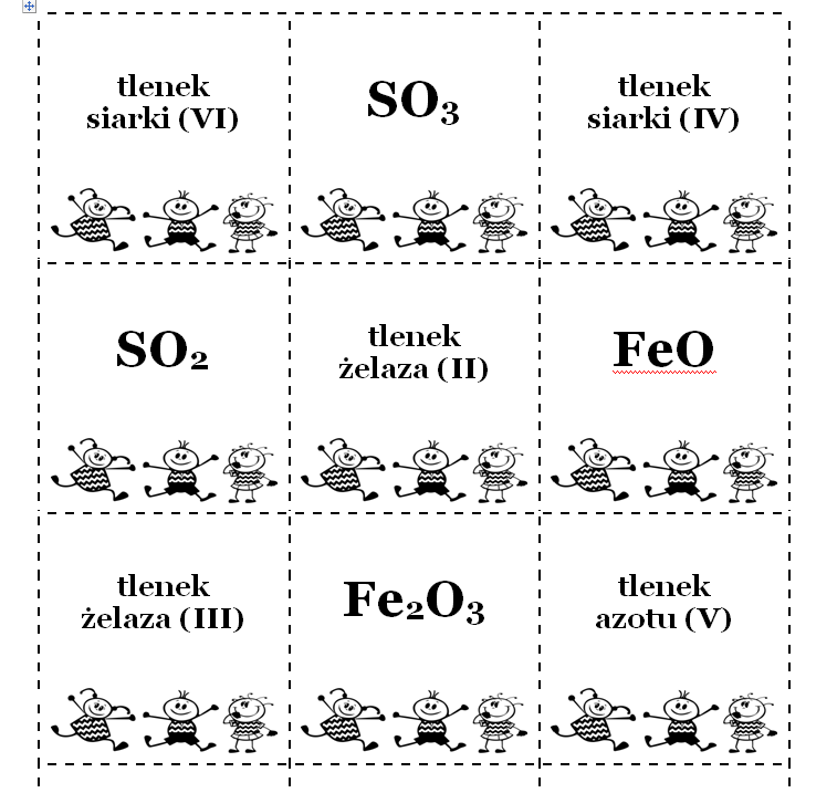 Gra chemiczna stworzona z myślą o doskonaleniu umiejętności rozpoznawania wzorów sumarycznych tlenków metali i niemetali. Polecana głównie uczniom klas siódmych, ale może być również ciekawym urozmaiceniem powtórzenia materiału dla ósmoklasistów. Przygotowany przeze mnie zestaw kart przeznaczony jest do gry w 2-3 osobowych zespołach.