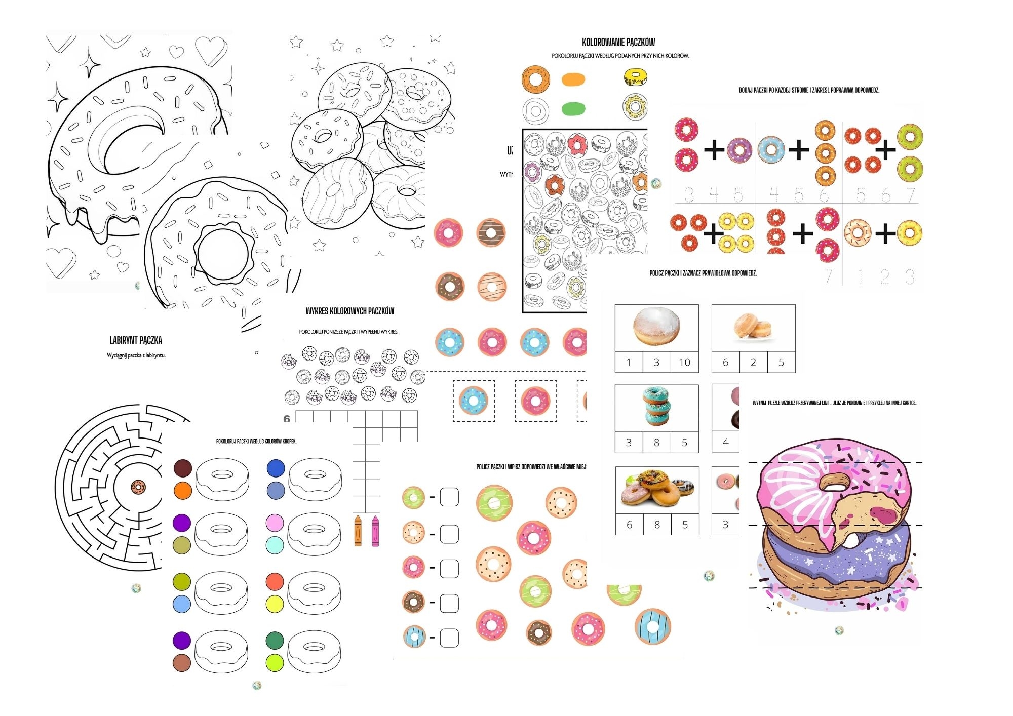 Kolorowe, estetyczne grafiki oraz różnorodne aktywności sprawią, że dzieci z radością wezmą udział w zajęciach, a sala nabierze „pączkowego” klimatu 🍩