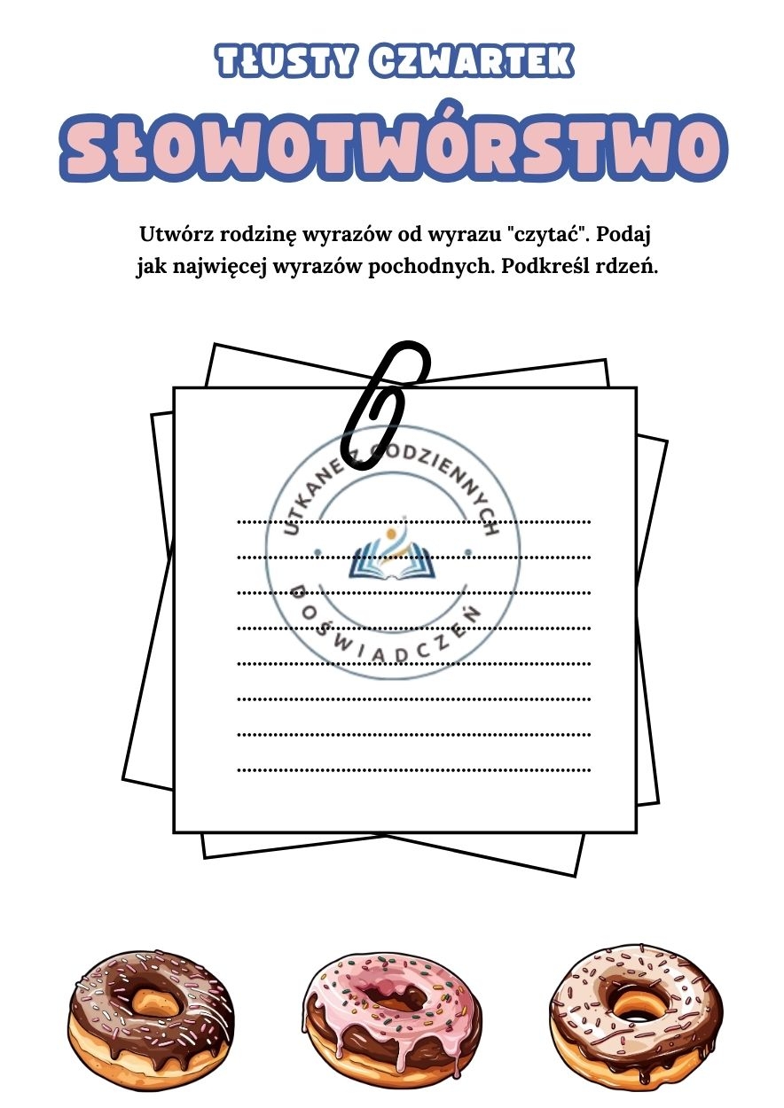 Tłusty czwartek to dzień, który kojarzy się z pączkami, radością i odrobiną słodkiego szaleństwa. A co, jeśli ten wyjątkowy dzień połączymy z wartościową, angażującą lekcją języka polskiego? Ten zestaw kart pracy pozwala wprowadzić uczniów w świat słowotwórstwa w sposób lekki, zabawny i niezwykle skuteczny. W materiałach znajdziesz różnorodne zadania dotyczące m.in.: tworzenia rodzin wyrazów, analizy przedrostków i przyrostków, rozpoznawania zdrobnień i zgrubień, rozróżniania zrostów, złożeń i zestawień, klasyfikowania wyrazów pochodnych według kategorii słowotwórczych, oraz wielu innych ćwiczeń rozwijających świadomość językową. Zestaw składa się z 50 kart, dzięki czemu nawet w dużej klasie każdy uczeń może pracować aktywnie, przygotować własną odpowiedź i zaprezentować ją koleżankom i kolegom. Do podglądu udostępniam trzy przykładowe karty, a osoby zainteresowane pełnym pakietem zapraszam do kontaktu indywidualnego. Uczniowie chętnie angażują się w pracę, a atrakcyjna grafika sprawia, że zadania stają się nie tylko edukacyjne, lecz także przyjemne i tematycznie dopasowane do świątecznego klimatu Tłustego Czwartku. To idealny sposób, by połączyć naukę ze świetną zabawą — i odrobiną słodkości!