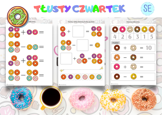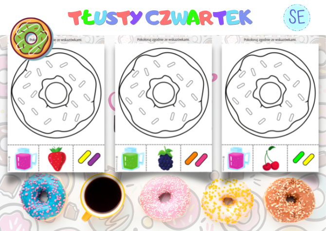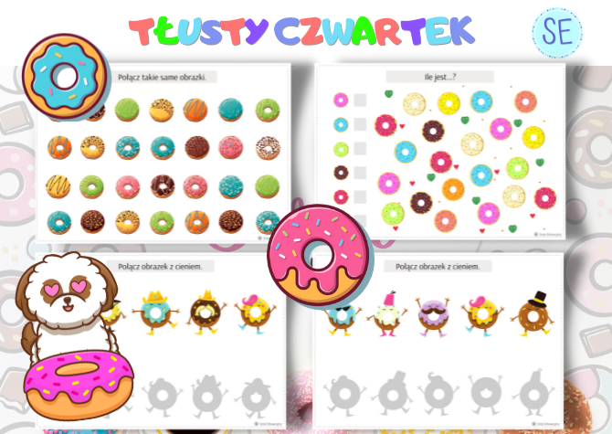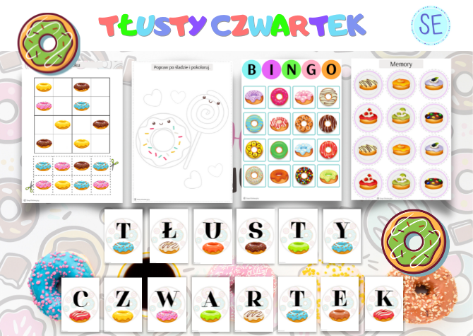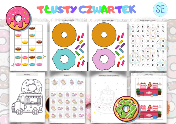 ??? W zestawie "Tłusty czwartek" znaleźć można między innymi: ✨ napis girlandę, ?✨ pączkowe bingo, ✨ kolorowanki, ✨ pokoloruj pączki według kodu, ✨ memory, ✨ sudoku, ✨ połącz takie same pączki, ✨ obliczenia z kodem, ✨ znajdź różnice.