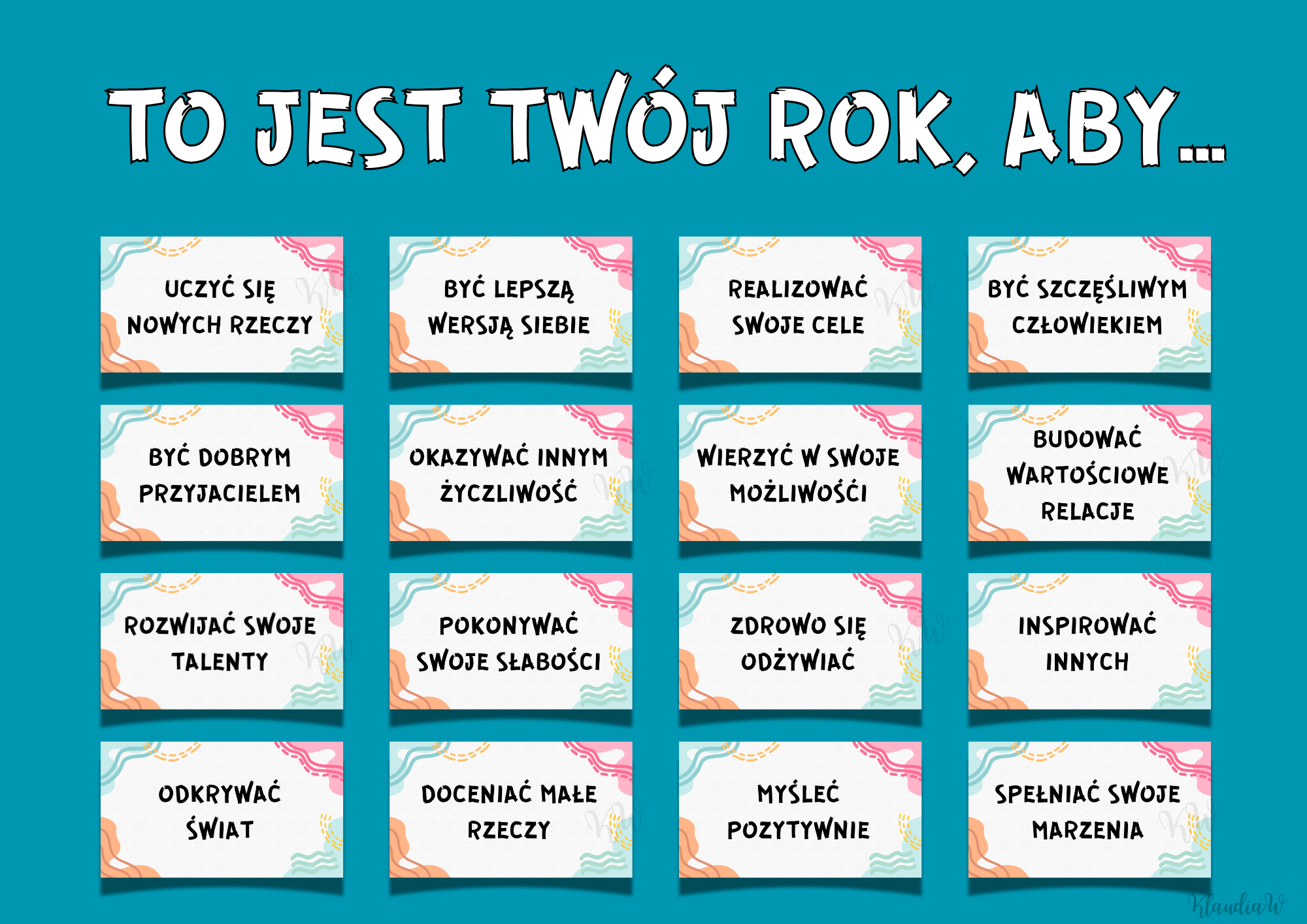 Gazetka świetnie sprawdzi się na korytarzu, w klasie, bibliotece czy świetlicy szkolnej, tworząc przyjazną atmosferę i motywując uczniów. W zestawie napis „TO JEST TWÓJ ROK, ABY...” (literka po wydrukowaniu ma ok. 9 cm) oraz 18 stron z hasłami motywującymi (o szerokości strony A4).