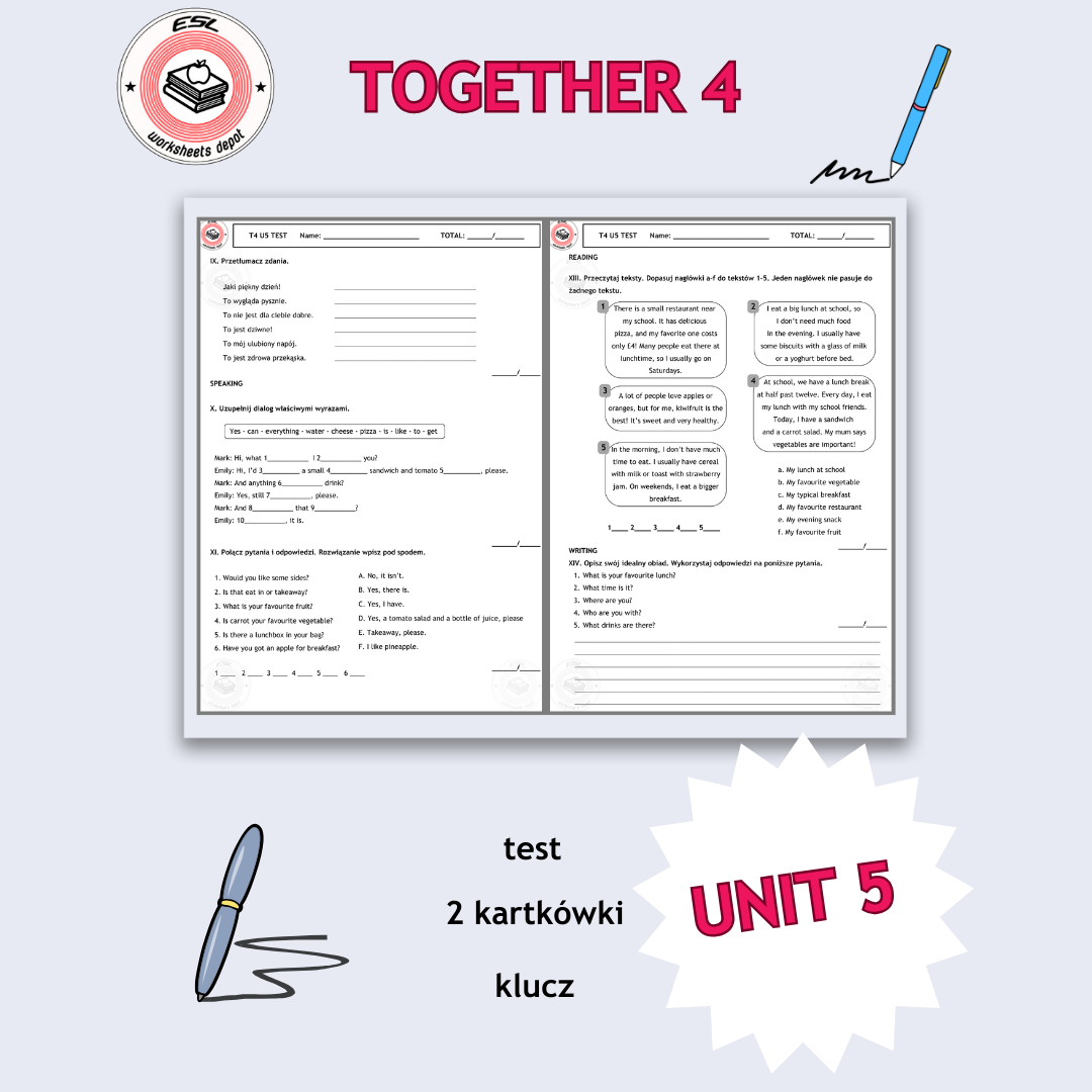 Polecam test i kartkówki sprawdzające wiedzę z działu 5 dla podręcznika Together 4.