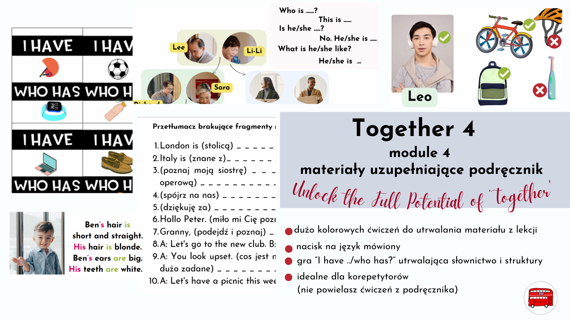 Materiał przygotowany z myślą o korepetytorach, których uczniowie korzystają z podręcznika Together (aby przerobić realizowany materiał bez zaglądania do podręcznika) oraz dla nauczycieli, którzy chcą uatrakcyjnić swoje zajęcia.