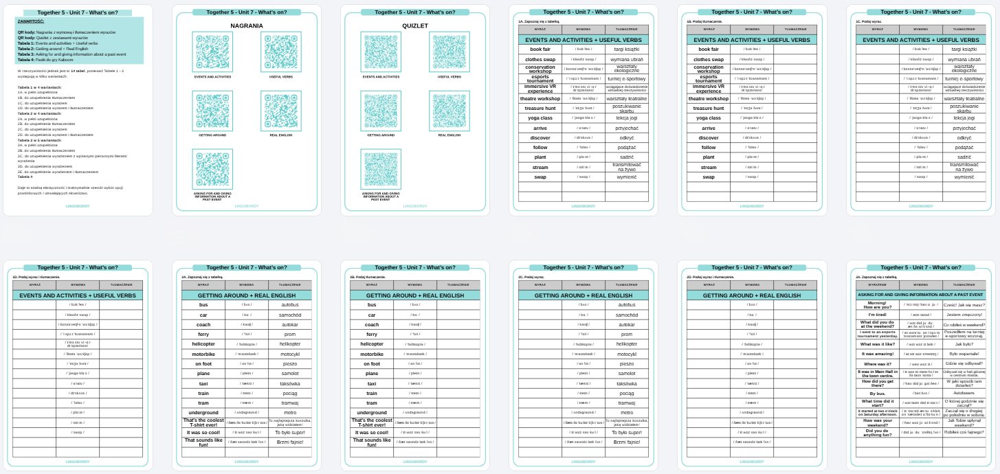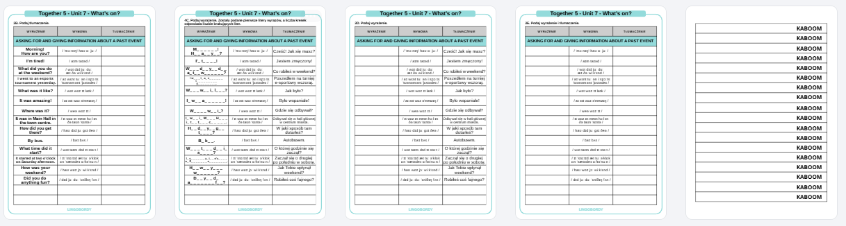 ZAWARTOŚĆ: QR kody: Nagrania z wymową i tłumaczeniem wyrazów DLA UCZNIÓW - którzy mają problem z zapamiętaniem nawet pojedynczych słówek, a co dopiero dłuższych wyrażeń składających się z kilku wyrazów - którzy muszą powtórzyć wyraz wiele razy, żeby został z nimi na dłużej, a nie mają pomocnych i motywujących do powtórek materiałów (podręcznik i ćwiczenia nie wystarczają), - którym ciężko jest nauczyć się tego, jak poprawnie zapisać wyraz - nie jest tajemnicą, że angielski nie jest najłatwiejszy do opanowania zapisu, a tu dostają gotową schludną listę, przy pomocy której mogą uczyć się zapisu słówek nieskończenie wiele razy (pomysł z kolumną wystającą spod kartki), co ważne - na papierze - nie w aplikacji, gdzie pisze się na wirtualnej klawiaturze, która często podpowiada gotowy wyraz, a przecież kartkówki, sprawdziany i egzaminy są do napisania odręcznie, - dla których specjalnie powstała wersja tabeli, gdzie podane są pierwsze litery wyrazów wchodzących w skład wyrażenia, a ilość kresek, które pojawiają się po pierwszej literze, odpowiada ilości liter w danym wyrazie; minimalizuje to ilość informacji potrzebnych do przetworzenia i zmniejsza ilość energii, którą należy włożyć w proces skupienia się; niewątpliwie stanowi przyjazne ułatwienie dla tych uczniów, którzy mają problem z zapamiętywaniem dłuższych wyrażeń; dostarcza pomocną wizualizację, która wspiera proces zapamiętywania. WSZYSTKO W JEDNYM MIEJSCU: