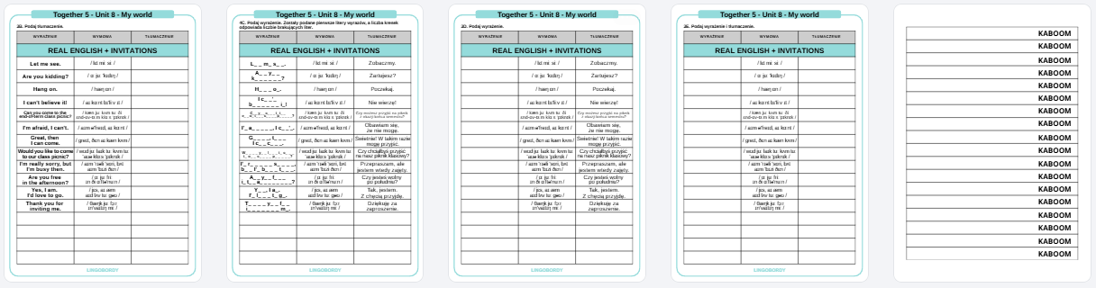 - którym ciężko jest nauczyć się tego, jak poprawnie zapisać wyraz - nie jest tajemnicą, że angielski nie jest najłatwiejszy do opanowania zapisu, a tu dostają gotową schludną listę, przy pomocy której mogą uczyć się zapisu słówek nieskończenie wiele razy (pomysł z kolumną wystającą spod kartki), co ważne - na papierze - nie w aplikacji, gdzie pisze się na wirtualnej klawiaturze, która często podpowiada gotowy wyraz, a przecież kartkówki, sprawdziany i egzaminy są do napisania odręcznie,