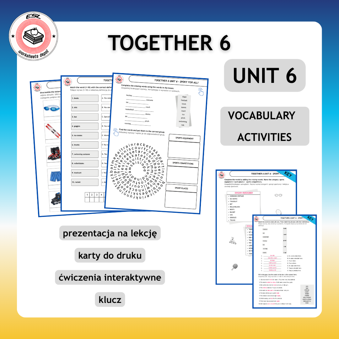 Ten pakiet został zaprojektowany tak, aby uczniowie naprawdę zapamiętali vocabulary z działu Sport for All!. Ponad 25 dodatkowych ćwiczeń, w tym 14 interaktywnych.