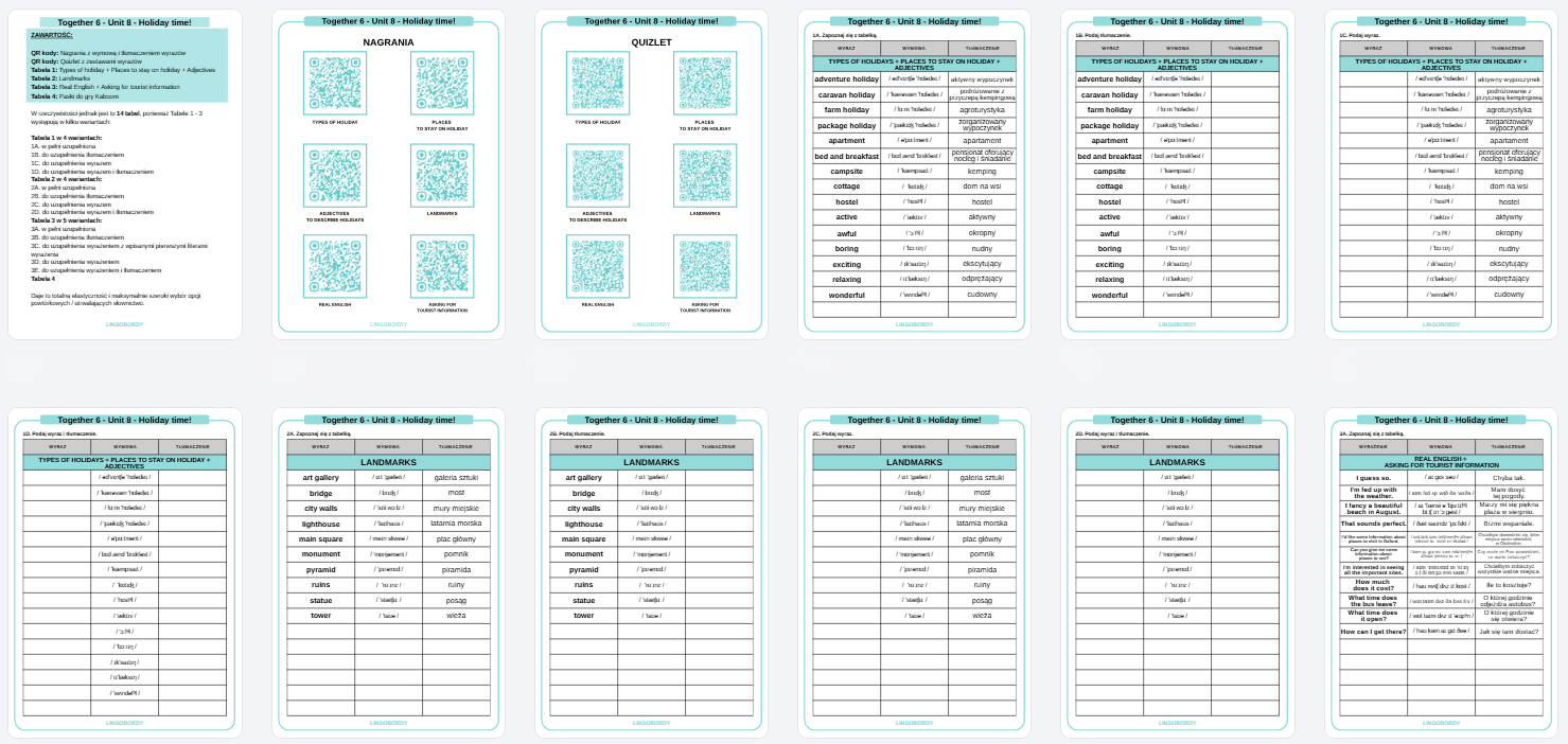 Tabela 1: Types of holiday + Places to stay on holiday + Adjectives to describe holidays