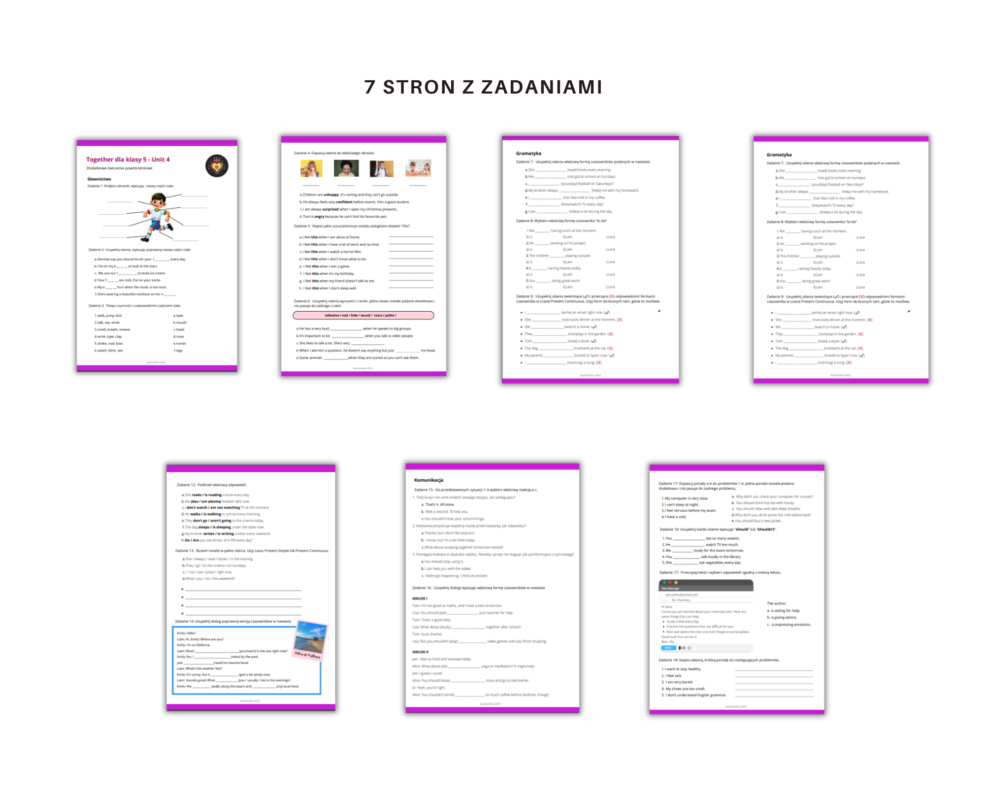 Zestaw ćwiczeń obejmuje 18 różnorodnych zadań (7 stron), przygotowanych w celu utrwalenia materiału z książki „Together” dla klasy 5, Unit 4.