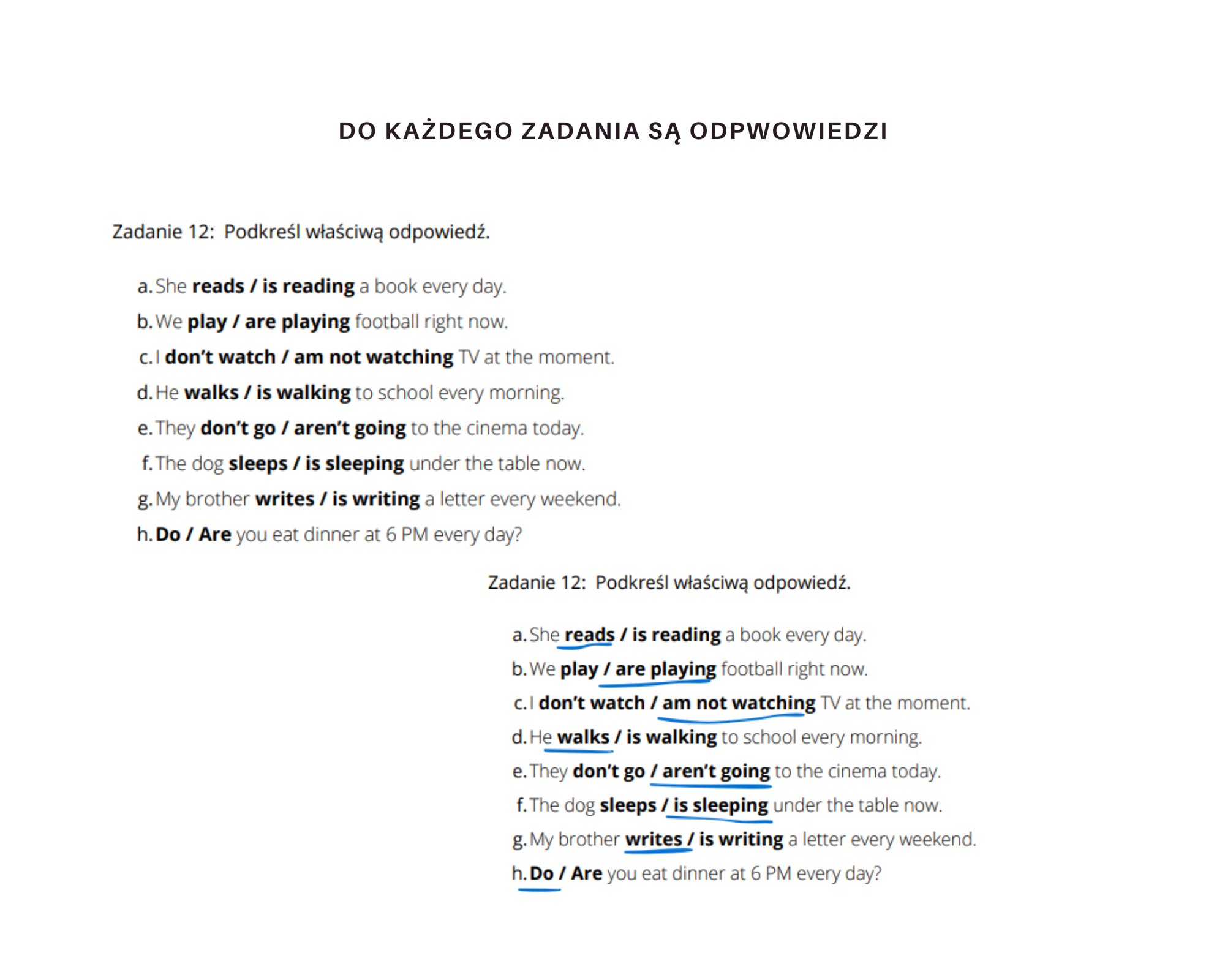 Wszystkie polecenia są napisane w języku polskim, a do zestawu dołączono uzupełnione karty pracy z odpowiedziami (7 stron)