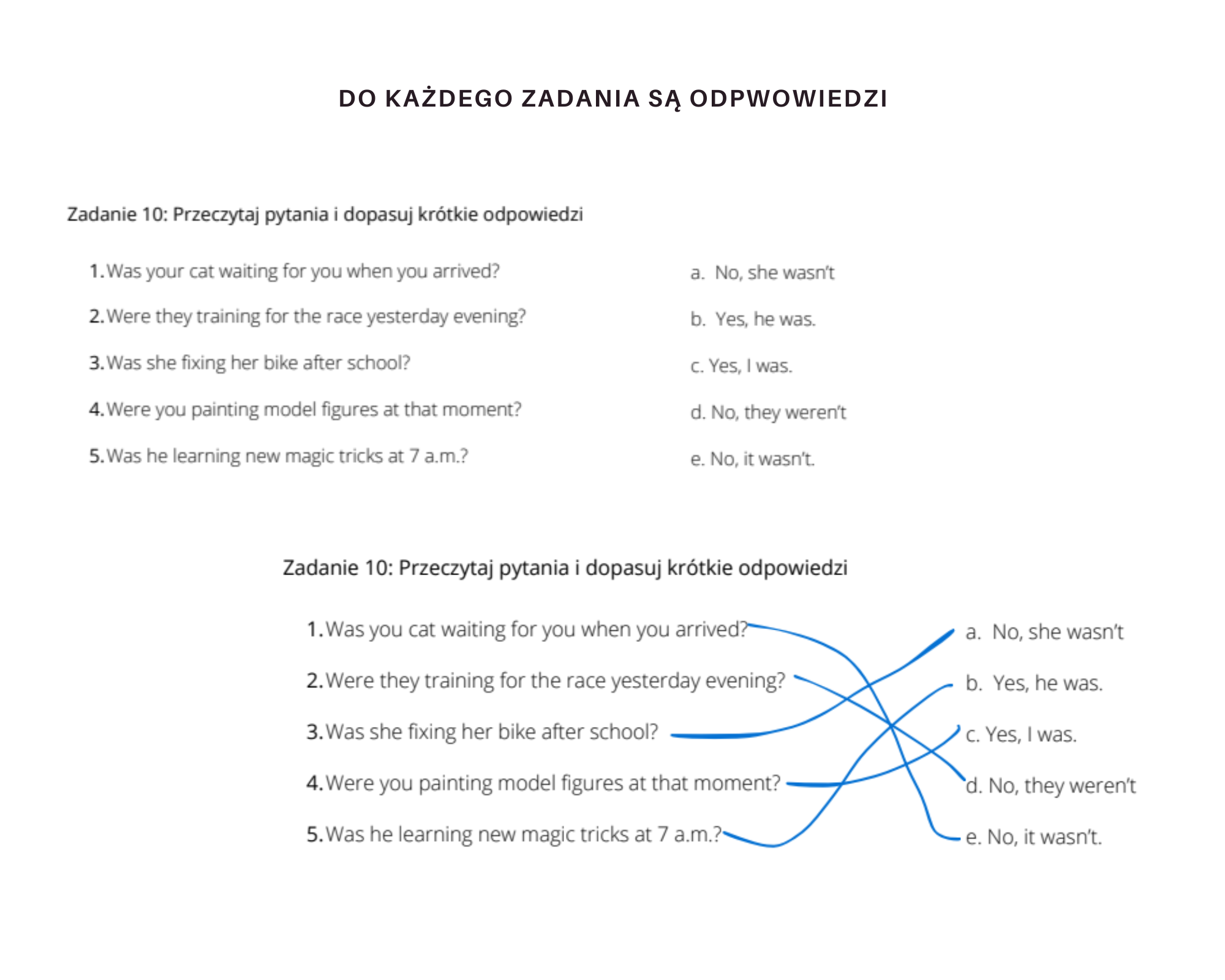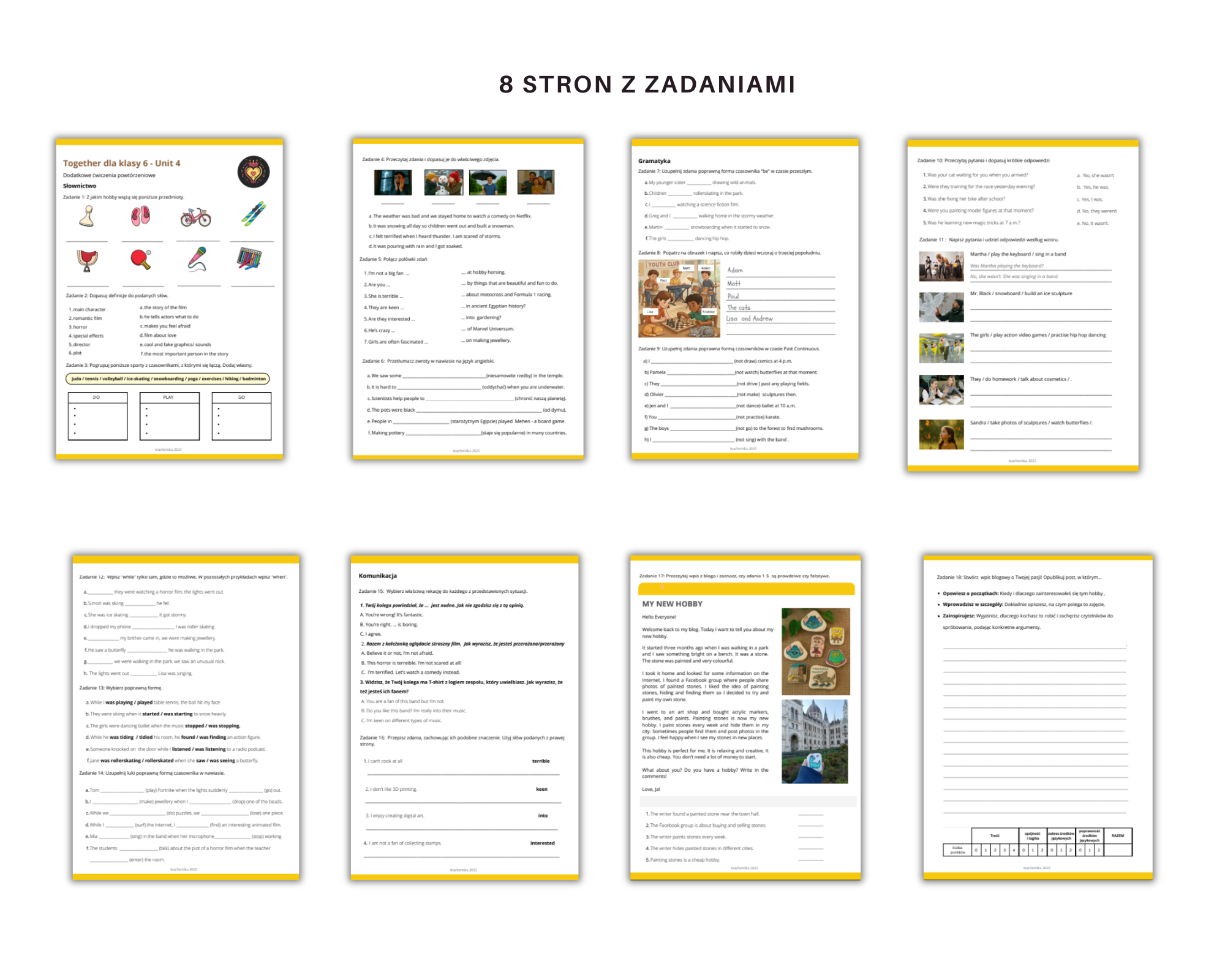 Ćwiczenia zostały podzielone na trzy główne sekcje, których celem jest kompleksowe powtórzenie materiału z Unit 4: Słownictwo – zadania koncentrujące się na powtórzeniu słownictwa z danego rozdziału: słownictwo związane z pasjami i zainteresowaniami, nazwy wybranych hobby, sportów, typy filmów i słowa z nimi związane, jak również zwroty z sekcji Real English i czytanki na str. 57. Gramatyka – zadania skupiające się na czasie przeszłym Past Continuous: poprawne dobieranie formy czasownika to be, zdania twierdzące, przeczenia, pytania i krótkie odpowiedzi. Zadania na stosowanie obu czasów przeszłych: Past Simple i Past Continuous, oraz użycie 'when' i 'while'. Komunikacja – sytuacje związane z oglądaniem filmów i wyrażaniem opinii o pasjach, zwroty związane z mówieniem o swoich umiejętnościach i zainteresowaniach (te również pojawiają się w sekcji słownictwo), krótki tekst z opisem hobby do ćwiczenia umiejętności czytania ze zrozumieniem i wyszukiwaniem konkretnych informacji oraz przykładowe zadanie egzaminacyjne – wpis na bloga z opisem hobby. Wszystkie polecenia są napisane w języku polskim, a do zestawu dołączono uzupełnione karty pracy z odpowiedziami. W razie pytań zachęcam do kontaktu.