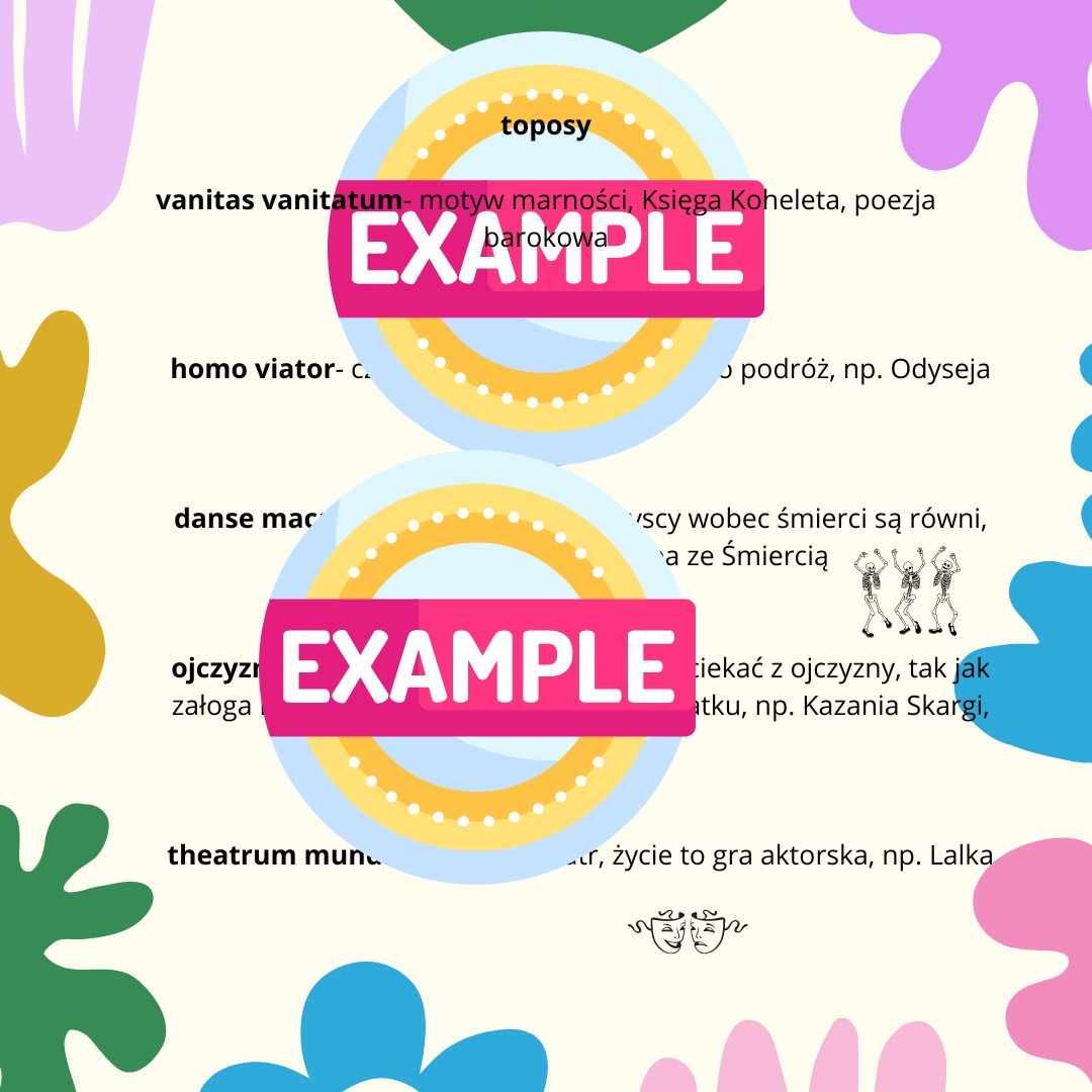 Polecam popularne motywy w formie naklejki z obrazkami, łatwy sposób na zapamiętanie toposów, np. theatrum mundi, vanitas vanitatum. W pliku 4 strony tej samej treści, aby ułatwić drukowanie.