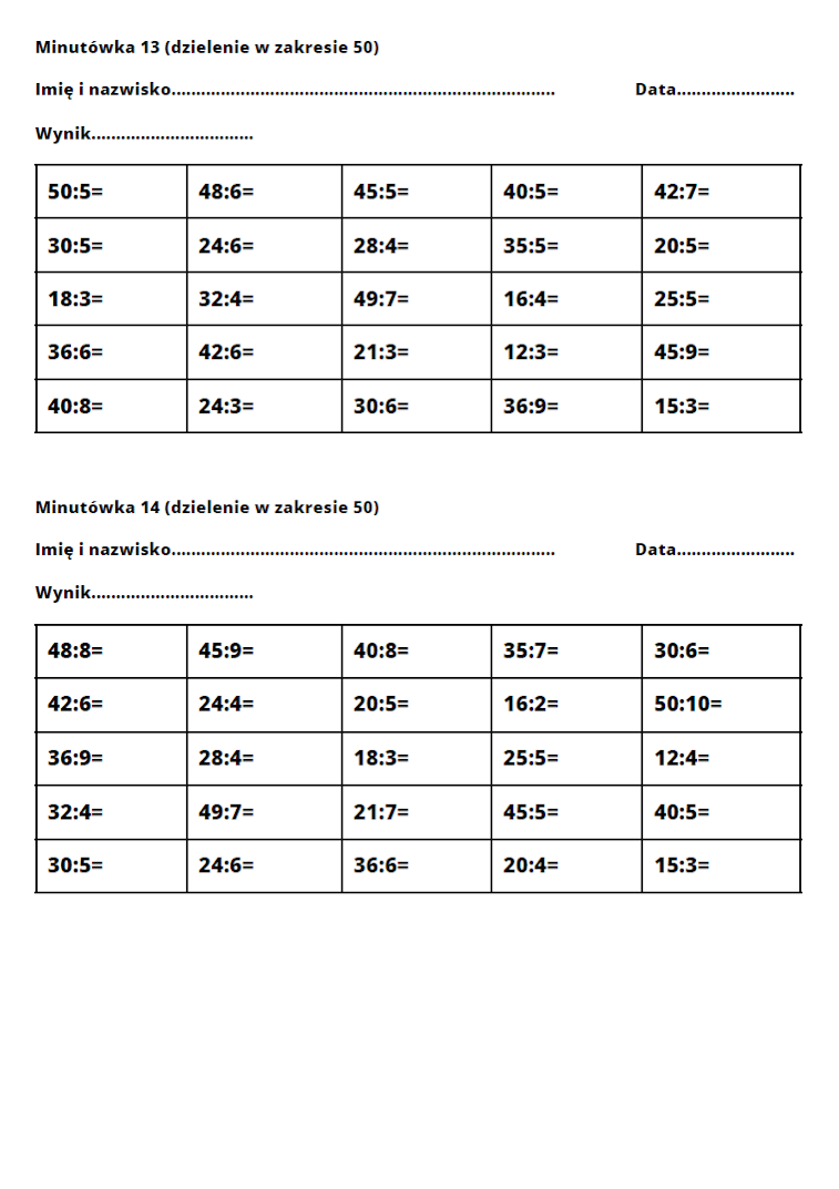 Trening dzielenia - zestaw kart umożliwiający doskonalenie dzielenia. Podczas pracy z wykorzystaniem tych gier matematycznych dzieci doskonalą dzielenie w zakresie 30, 50 oraz 100. W skład zestawu wchodzi 15 kart do samodzielnego wydrukowania. Zalety: - doskonalenie dzielenia - rozwijanie pamięci - ćwiczenie skupienia uwagi, cierpliwości - wykonywanie obliczeń pod presją czasu