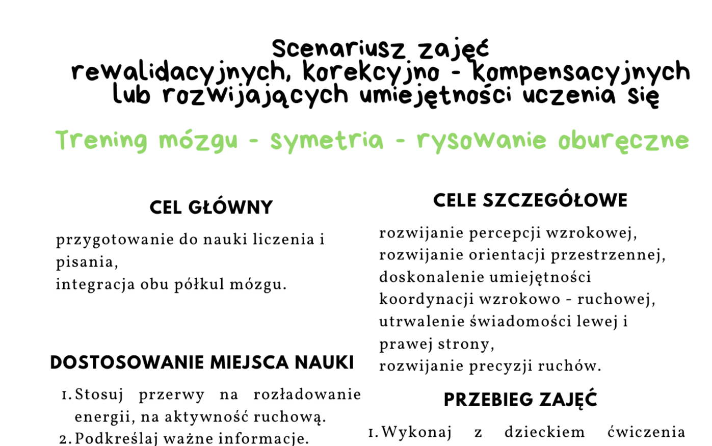 Trening mózgu - symetria - rysowanie oburącz Materia składa się ze scenariusza oraz 50 kart pracy dla ucznia. Ćwiczenia można wykonywać na zajęciach rewalidacyjnych, korekcyjno — kompensacyjnych, rozwijających umiejętności uczenia się.