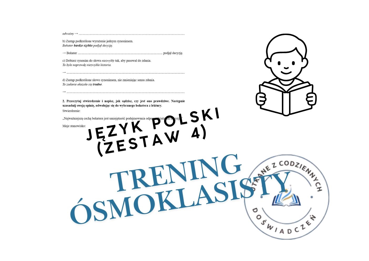 Jeśli przygotowujesz się do egzaminu ósmoklasisty i chcesz pewnie opanować jedne z najczęściej sprawdzanych umiejętności, ten zestaw będzie dla Ciebie świetnym wyborem. Zestaw 4 łączy praktyczne ćwiczenia językowe z zadaniami rozwijającymi myślenie, argumentację i czytanie ze zrozumieniem — dokładnie to, czego potrzebujesz przed egzaminem.