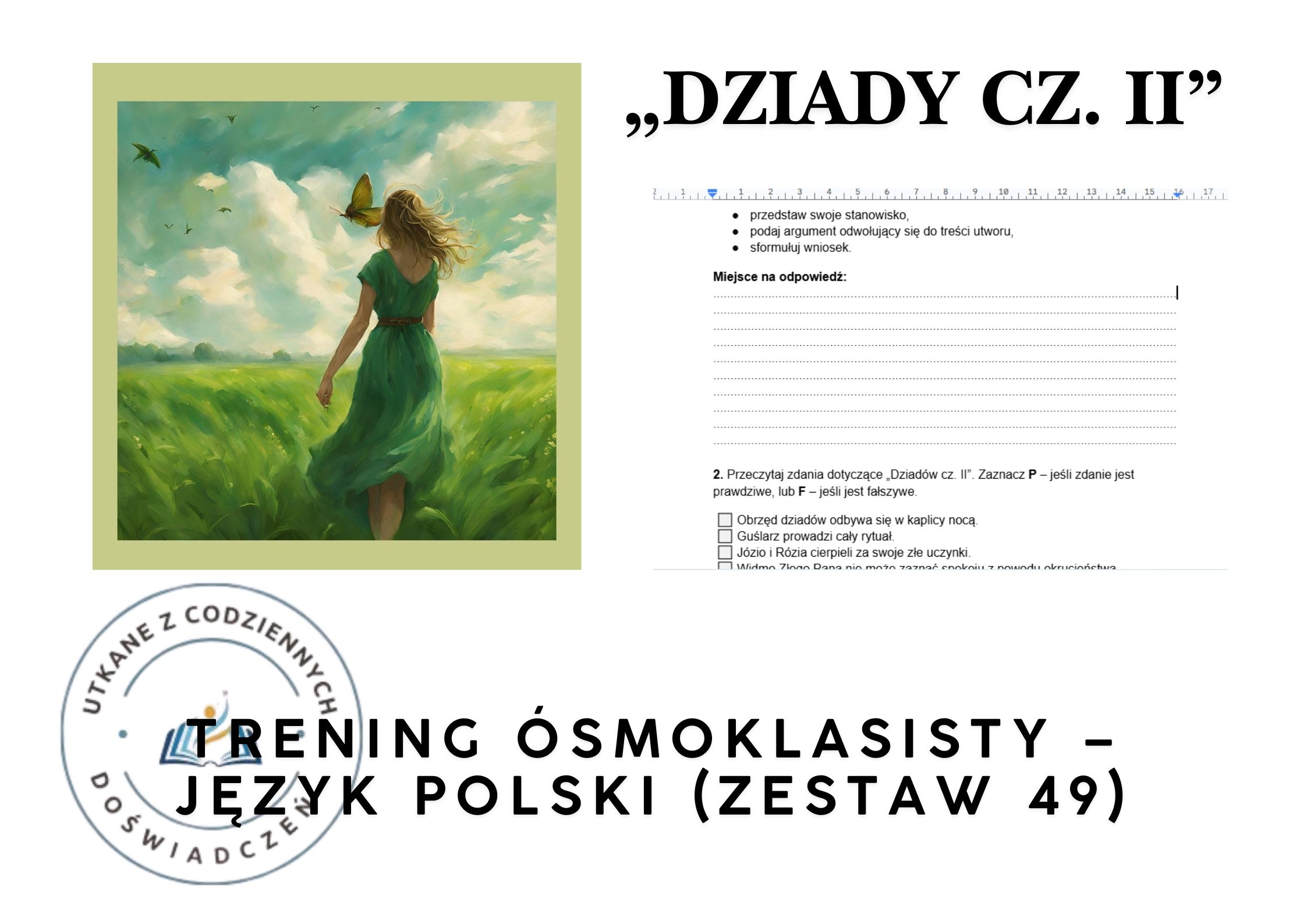 Ten materiał to gotowy zestaw, który pomaga uczniom naprawdę zrozumieć „Dziady cz. II” i opanować jedną z najtrudniejszych umiejętności egzaminacyjnych: przekształcanie zdań oraz rozpoznawanie strony czynnej i biernej. Zestaw 49 został przygotowany tak, aby uczeń mógł samodzielnie ćwiczyć, a nauczyciel — szybko i wygodnie sprawdzać pracę dzięki pełnemu kluczowi odpowiedzi.
