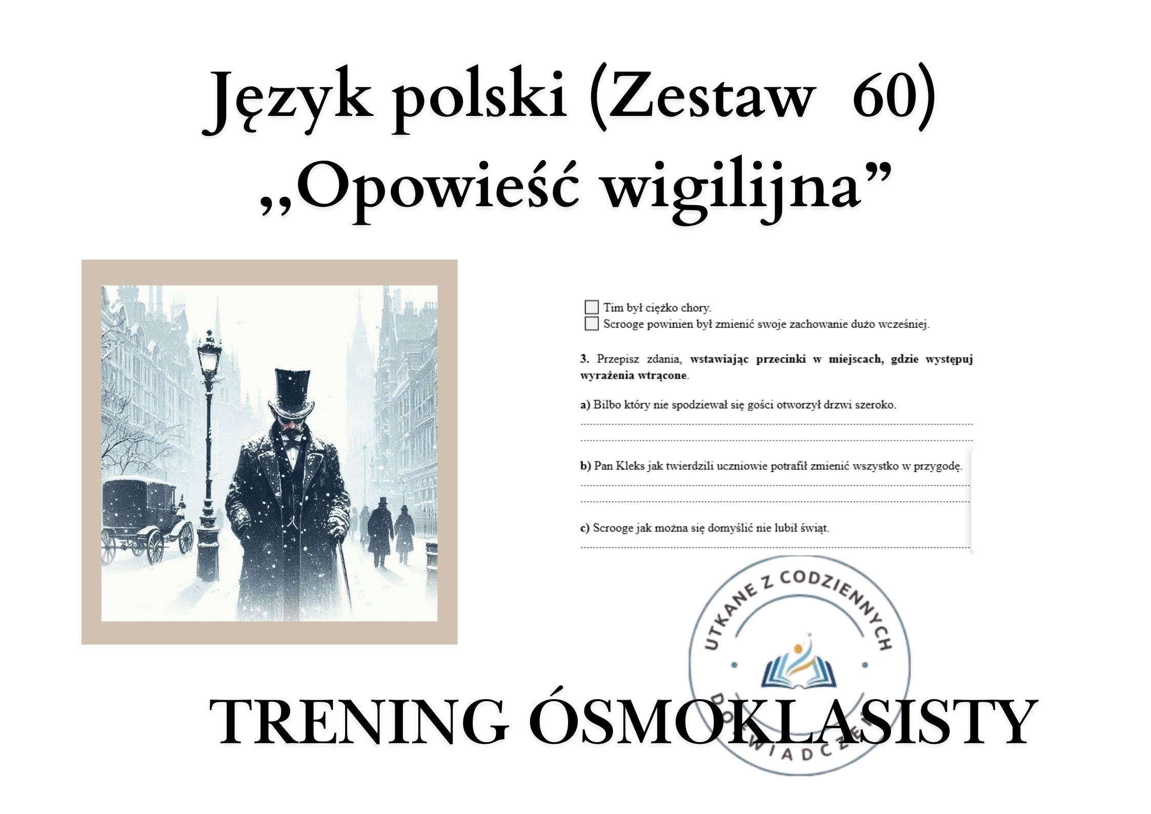 „Trening ósmoklasisty – język polski (zestaw 60)” to świetnie opracowany pakiet zadań oparty na Opowieści wigilijnej, który łączy w sobie wszystko, co najważniejsze: