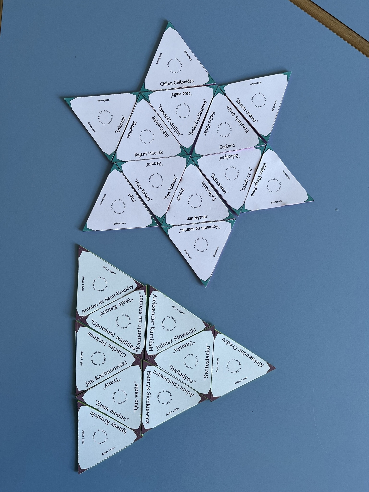 Zestaw zawiera 2 układanki - jedna w w kształcie gwiazdy, druga trójkąta. Jedna to łączenie wybranych bohaterów (imiona) z tytułem lektury, druga to łączenie tytułu z autorem książki. Lektury obowiązkowe do egzaminu ósmoklasisty.