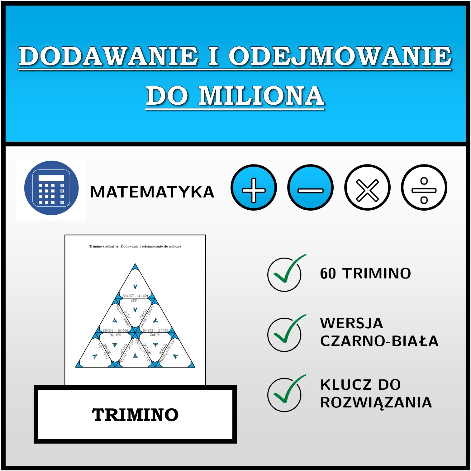 W materiale znajduje się łącznie 60 różnych zestawów trimino na temat dodawanie i odejmowanie do miliona w następującym układzie: