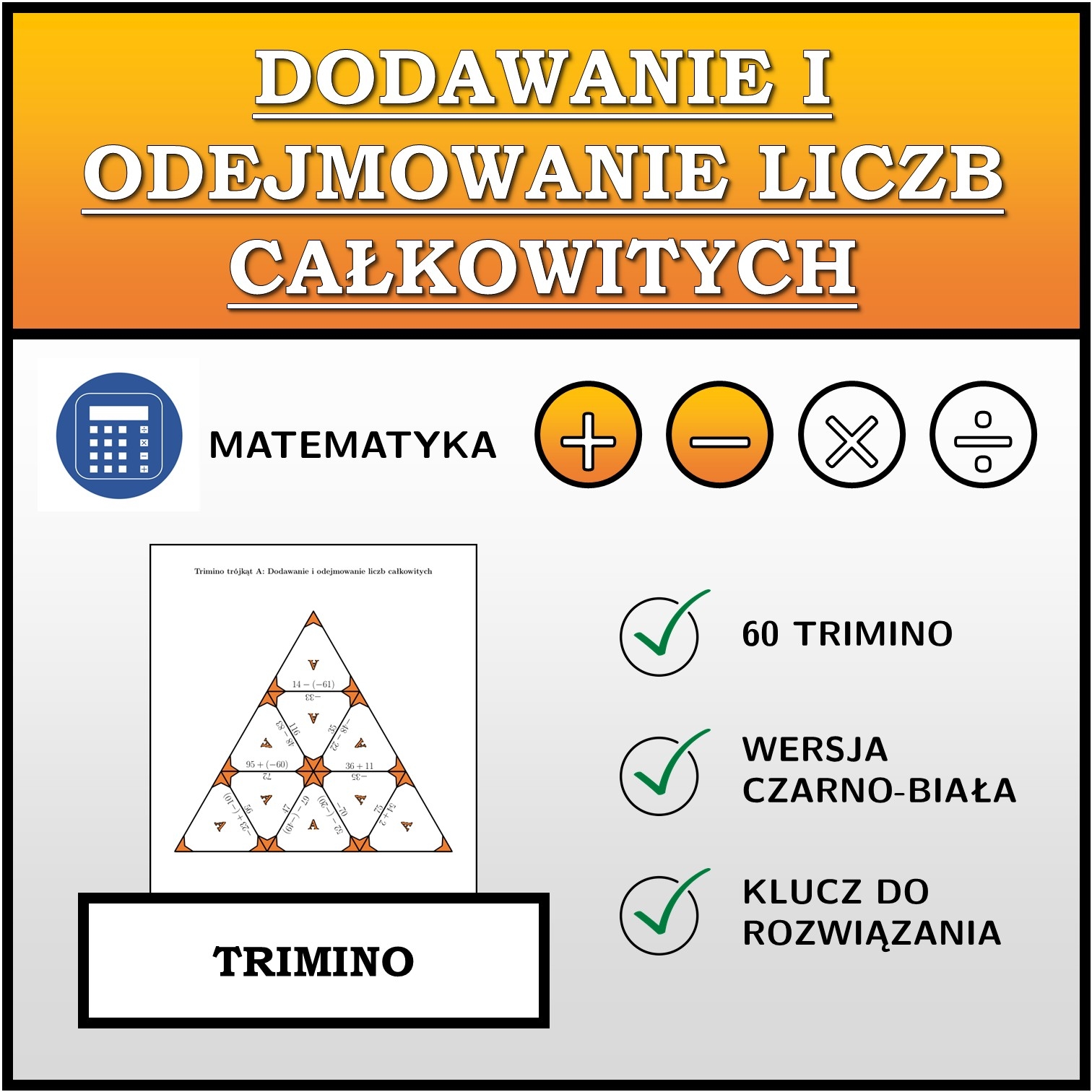 W materiale znajduje się łącznie 60 różnych zestawów trimino na temat dodawanie i odejmowanie liczb całkowitych w następującym układzie: