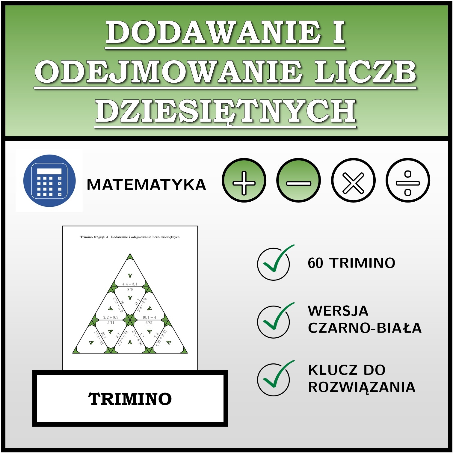 W materiale znajduje się łącznie 60 różnych zestawów trimino na temat dodawanie i odejmowanie liczb dziesiętnych w następującym układzie: