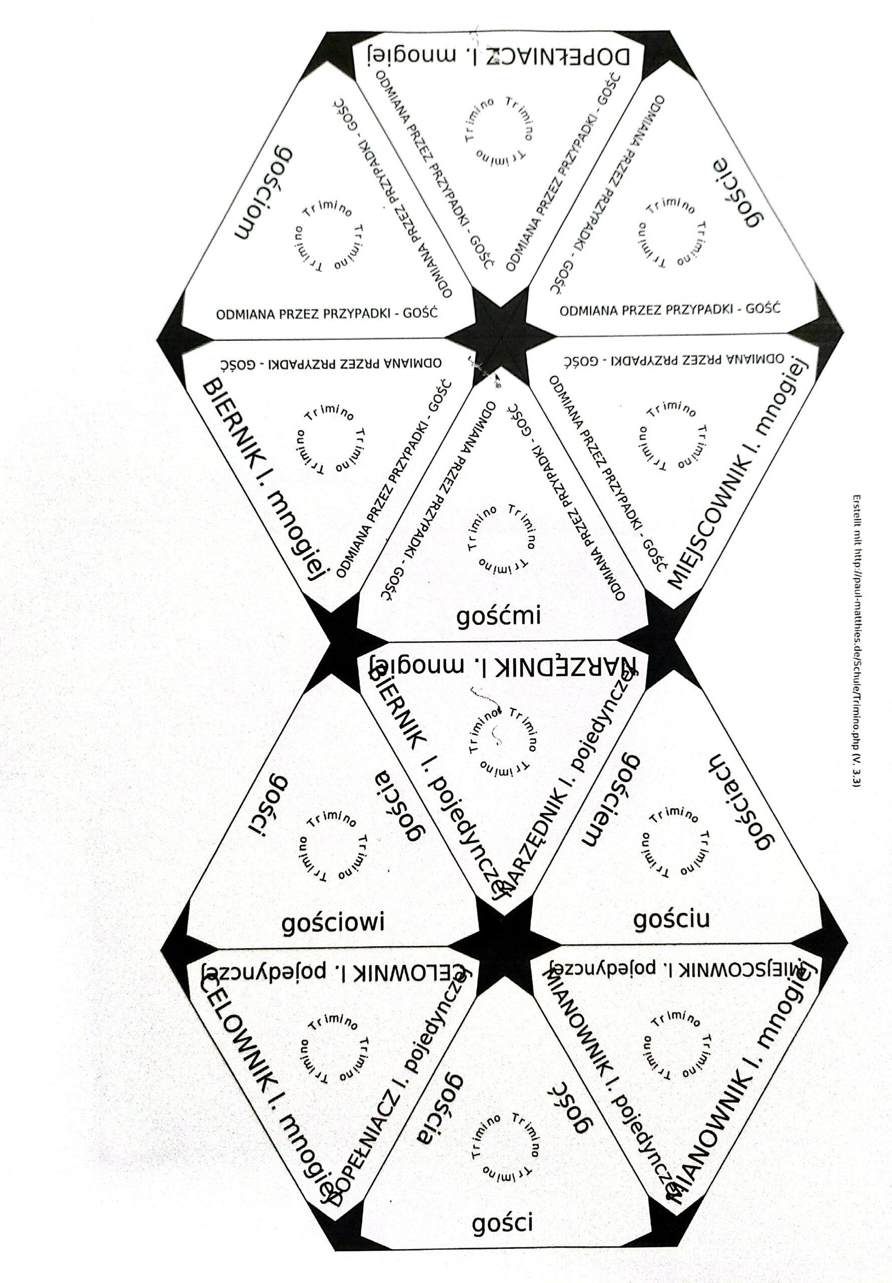 Trimino (12 elementów) dotyczące odmiany przez przypadki słowa "GOŚĆ". Format JPG