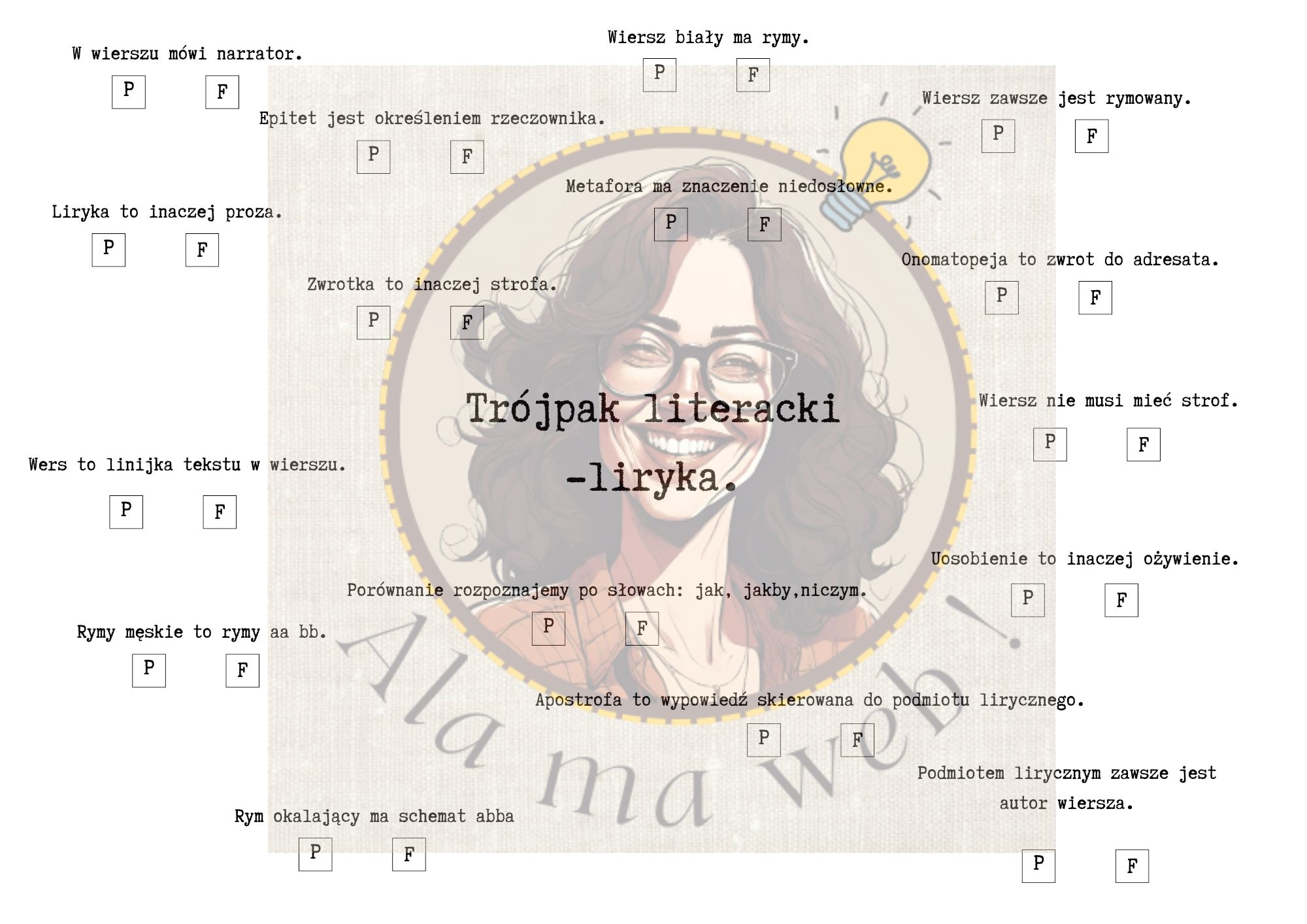 Materiał został przygotowany z myślą o uczniach szkoły podstawowej, szczególnie klas 7–8. Zawiera zadania typu prawda/fałsz, które pomagają utrwalić najważniejsze pojęcia z teorii literatury w prosty i przejrzysty sposób.