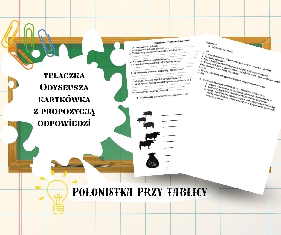 Materiał to kartkówka z pytaniami o treść mitu o Odyseuszu i jego tułaczce. Oprócz tego są również trzy grafiki nawiązujące do treści mitu.