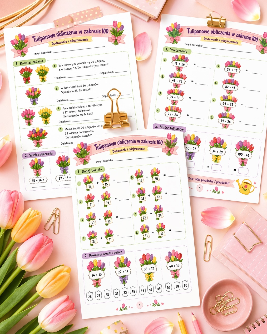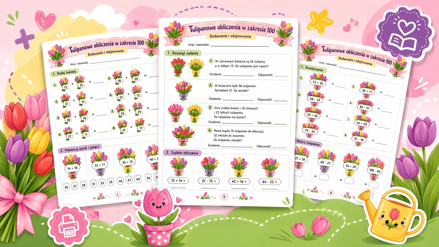 Przedstawiam wiosenną kartę pracy / mini zestaw zadań matematycznych dla uczniów klas 1–2. Materiał zawiera 6 stronpełnych ćwiczeń na dodawanie i odejmowanie w zakresie 100, a wszystko w lekkiej, przyjaznej dzieciom tulipanowej odsłonie. 🌸