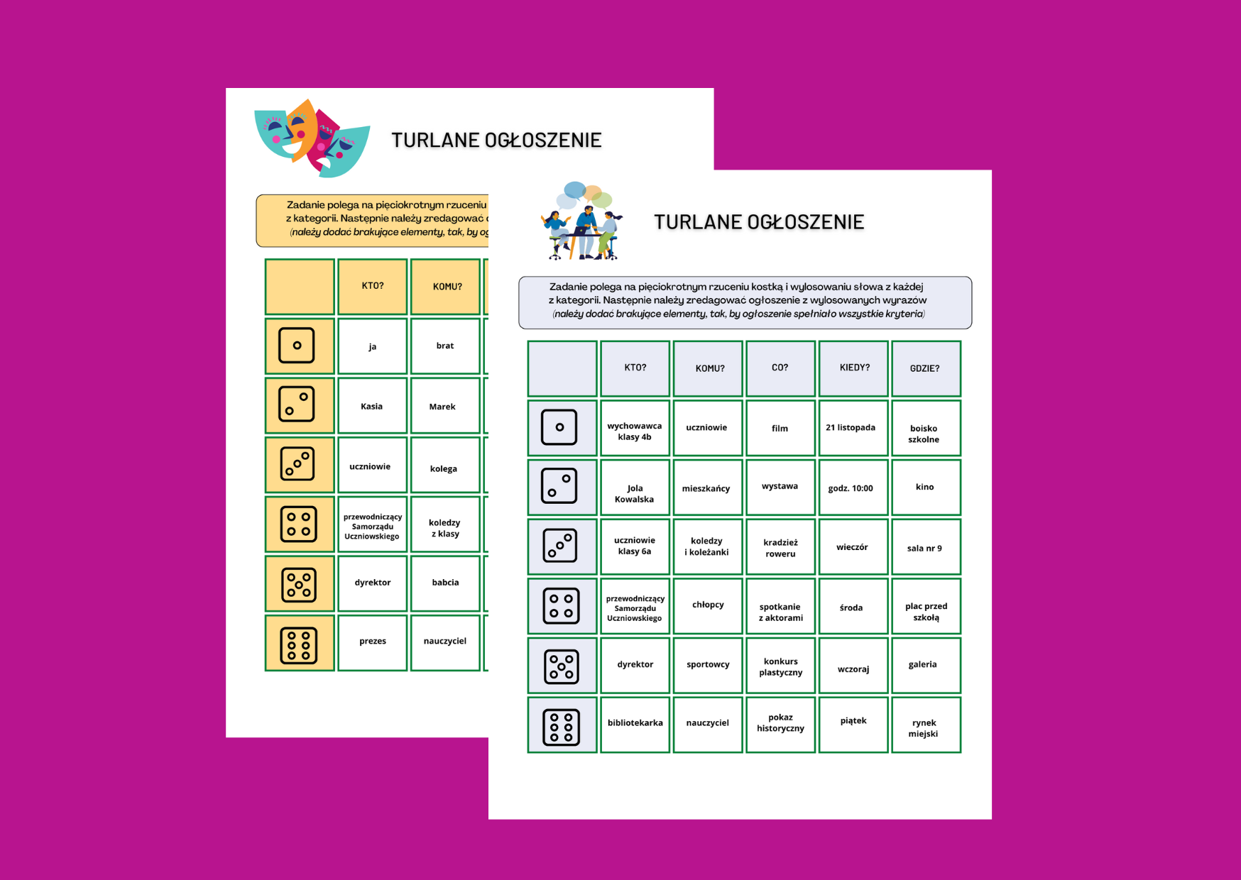 2 wersje (kolorowa i czarno-biała) kart z wyrazami kojarzącymi się z ogłoszeniem, które podzielone są na kategorie. Uczeń rzuca pięciokrotnie kostką do gry i wykorzystując wylosowane słowa redaguje ogłoszenie (jeśli to konieczne, należy uzupełnić tekst o dodatkowe informacje, tak, aby zaproszenie spełniało wszystkie kryteria).