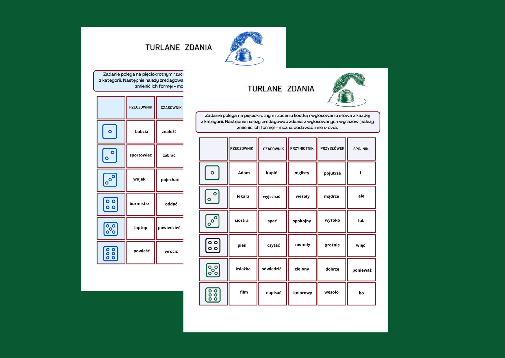 2 wersje kart z wyrazami, które podzielone są na kategorie: czasowniki, rzeczowniki, przymiotniki, przysłówki i spójniki. Uczeń rzuca pięciokrotnie kostką do gry i wykorzystując wylosowane słowa redaguje zdania (historyjkę).