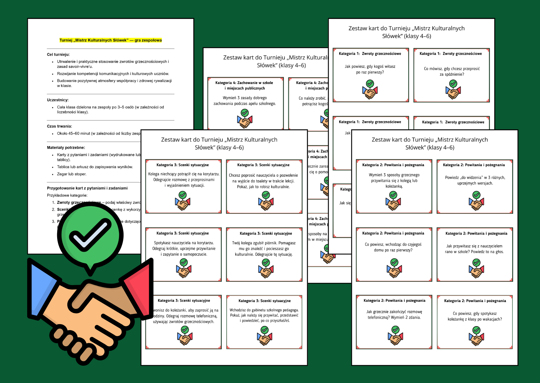 Turniej rozwija kompetencje językowe i społeczne, uczy empatii i kultury osobistej, a jednocześnie dostarcza mnóstwo radości. Idealny na godziny wychowawcze, szkolne dni tematyczne, zajęcia w bibliotece i świetlicy lub jako element innowacji pedagogicznej: https://zlotynauczyciel.pl/downloads/innowacja-pedagogiczna-savoir-vivre-i-kompetencje-kulturowe-dla-klas-4-6-zajecia-z-wychowawca/