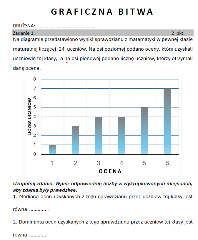 - Każda drużyna ma swoją nazwę (lub losuje ją z matematycznego zestawu, np. „Moda”, „Mediana”, „Z-score’y”).