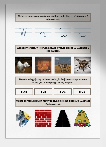 🔹 ćwiczenia językowe z czytaniem ze zrozumieniem i zaznaczaniem wyrazów z literą „u”